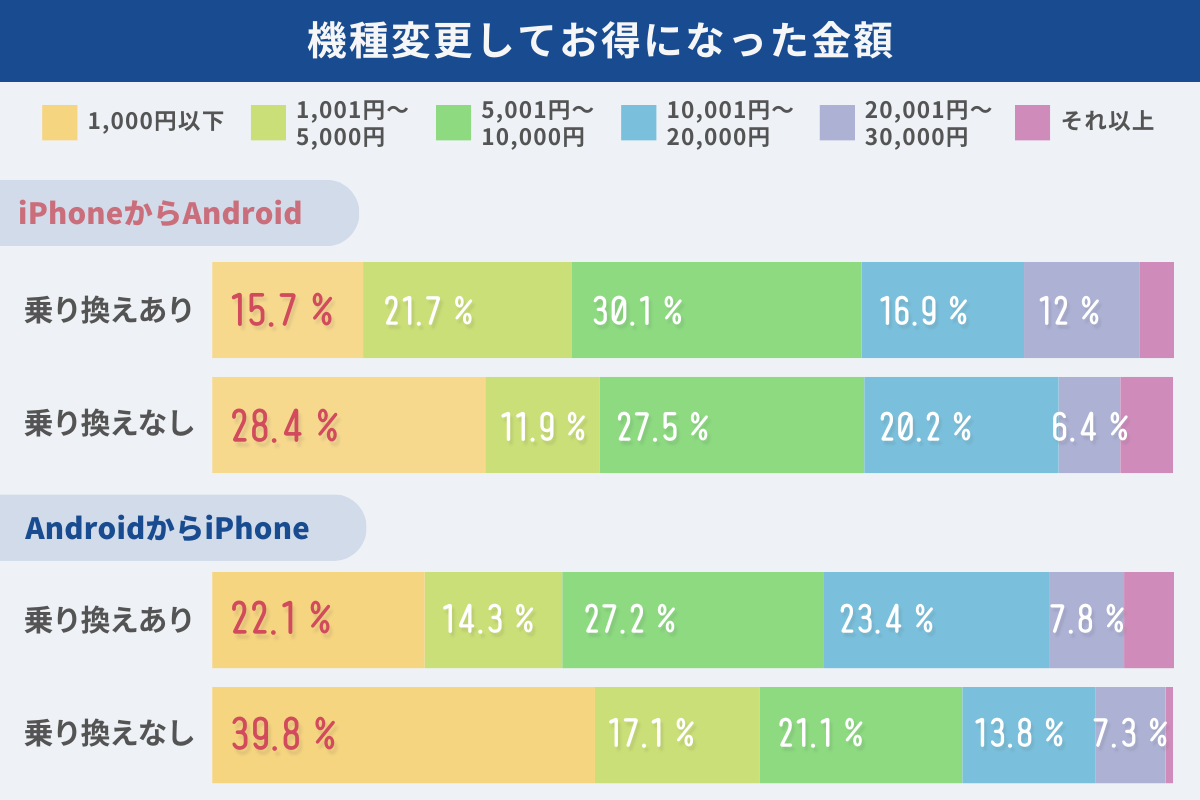 乗り換えをする場合は両者もそれほど大きな差はありませんでしたが、乗り換えをしない場合は「iPhoneよりもAndroidの方が特典を受けやすい(1万円以上のユーザー合計32.2%)」という結果になりました。