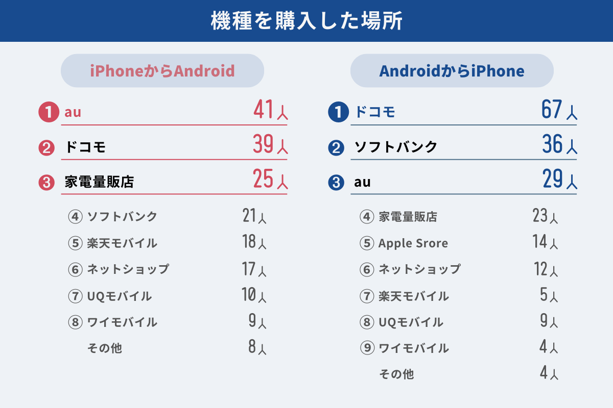 Androidの購入場所としてはauとドコモがそれぞれ40名前後で最多でした。ソフトバンクを抑え、家電量販店が3位(25人)です。