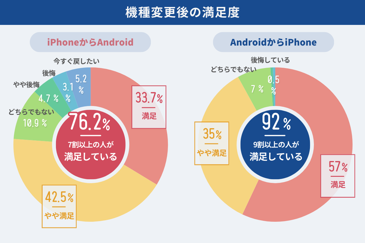 AndroidからiPhoneに機種変更した92%の方が「満足している」と回答しています。満足度の最低値も「後悔している(0.5%)」が最小で、機種変更したほとんどのユーザーが一定以上の満足感が得られるようです。
