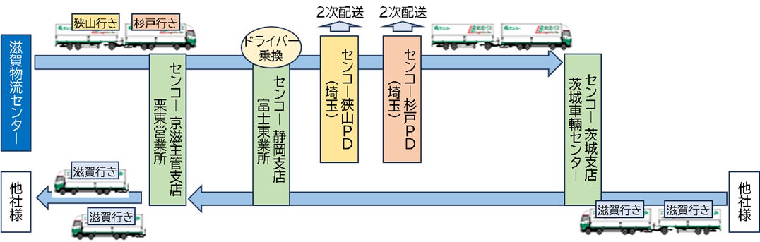 この取組みは、各社が協力して大型車による配送を同圏内で集約し、距離の長い幹線部分をダブル連結トラックを利用して輸送し、幹線でないルートは連結を解除して配送を可能としています。また、センコーがピントルフック付きトラクタを開発したことで有事の際も配送や車輛の回収が可能となったこと、中継地点での運転手乗り替わり輸送で、ドライバーの日帰り運行が可能となったことに加え、センコーグループの教育施設にて、時間をかけてドライバーを育成することで、排出CO₂削減、省人化等に寄与できていることが、物流の強靭・持続可能な取り組みであると評価されました。