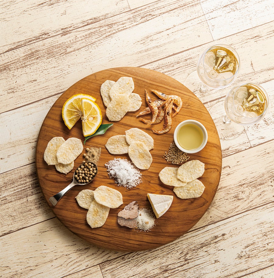富山湾の宝石「しろえび」を、富山米100%の生地にたっぷりと練りこみました。パリッとした食感の塩味ベースのしろえびせんべいをオリーブオイルとほのかな酸味で上品な味に調えました。