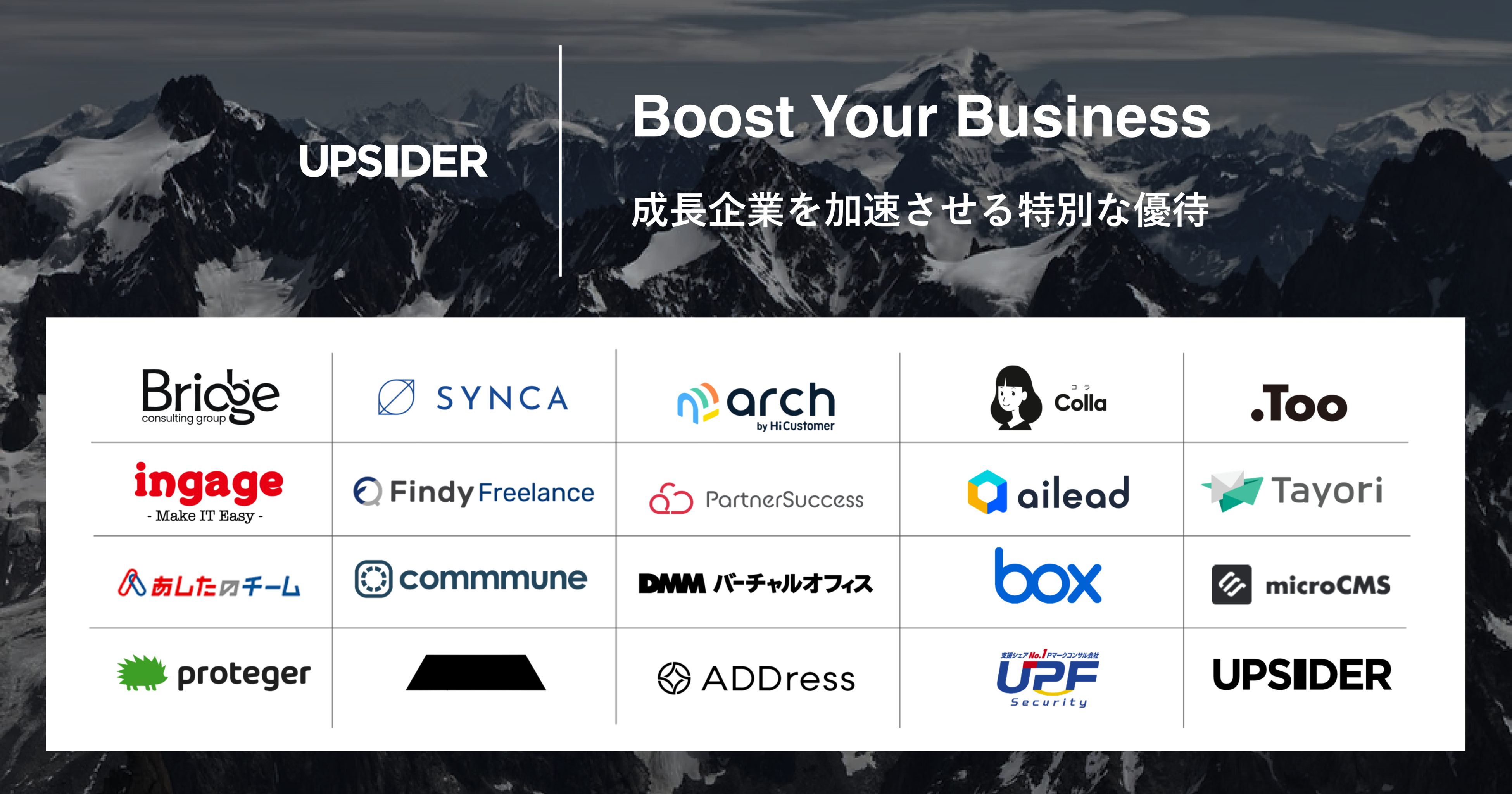 リワードプログラム「Boost Your Business」の第一弾として、以下の企業にご賛同いただき、優待サービスを提供いただきます。法人カード「UPSIDER」利用企業様が活用できるサービス、優待内容は次の通りです。