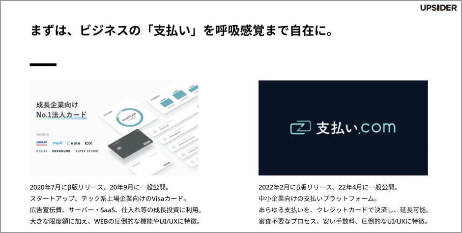 法人カード「UPSIDER」およびビジネスあと払いサービス「支払い.com」、グループ全体の利用社数は15,000社を超え、累計決済規模は1,000億円を超えています。今回発表したリワードプログラム「Boost Your Business」により、法人カード「UPSIDER」利用企業様にはより便利に、よりお得に「UPSIDER」をご利用いただける法人カードを目指してまいります。