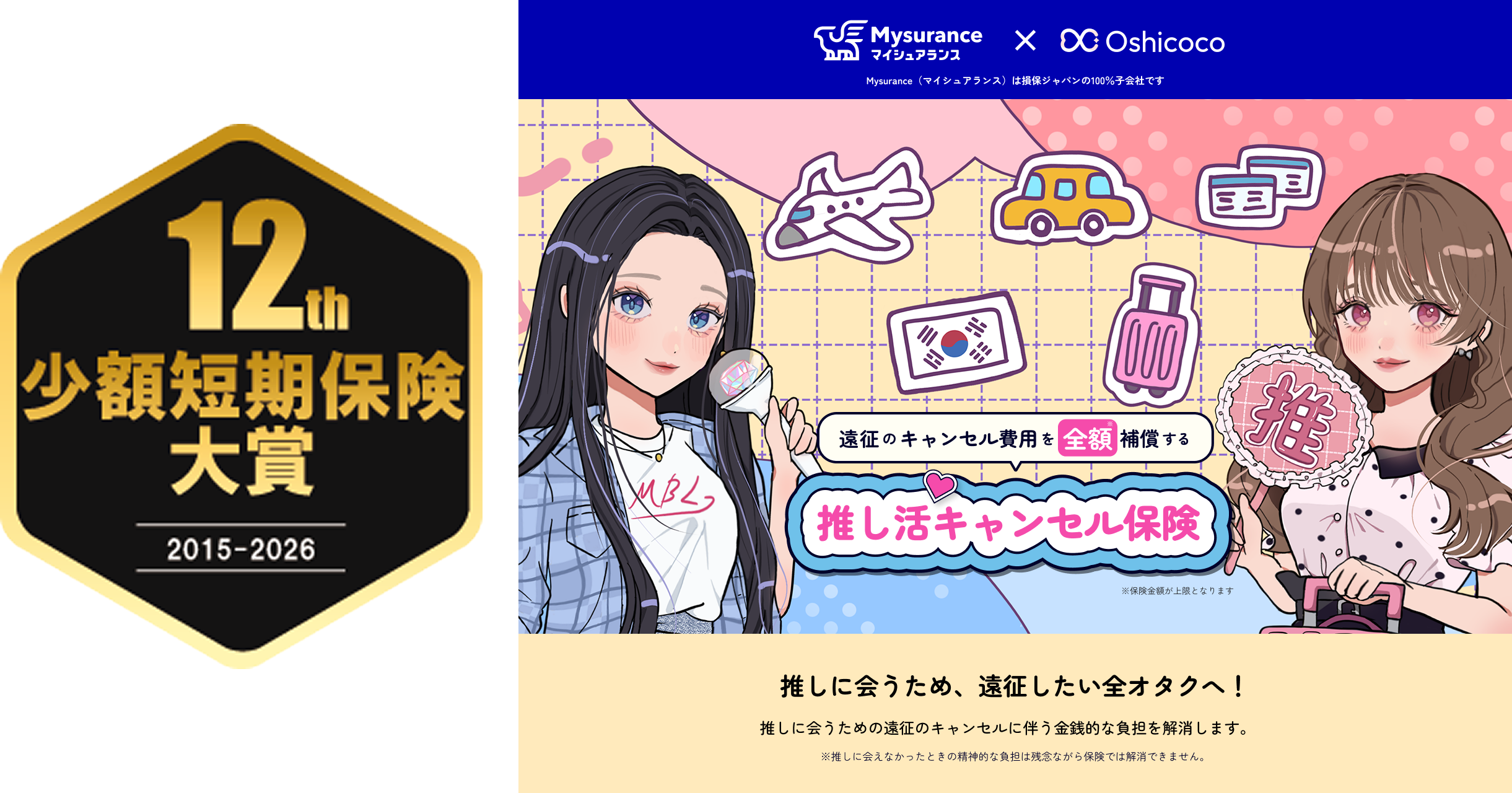 “オタクの遠征”に向き合い、「推しに会うために、国内外を飛び回りたい!」「推し活資金を有益に使いたい!」という推し活層に対して、「キャンセル保険の存在を知って欲しい」「保険商品をわかりやすく伝えたい」といった想いで「推し活キャンセル保険」専用サイトを開設しております。詳細は、以下をご参照ください。