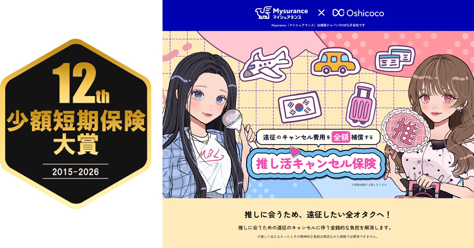 損害保険ジャパン株式会社(本社:東京都新宿区、代表取締役社長:石川 耕治)の子会社で少額短期保険業を営むMysurance(マイシュアランス)株式会社(本社:東京都新宿区、代表取締役社長:清水 廣臣、以下「Mysurance」)が展開する「推し活キャンセル保険」が、一般社団法人日本少額短期保険協会が主催するコンテストにおいて「第12回 少額短期保険大賞」を受賞しました。