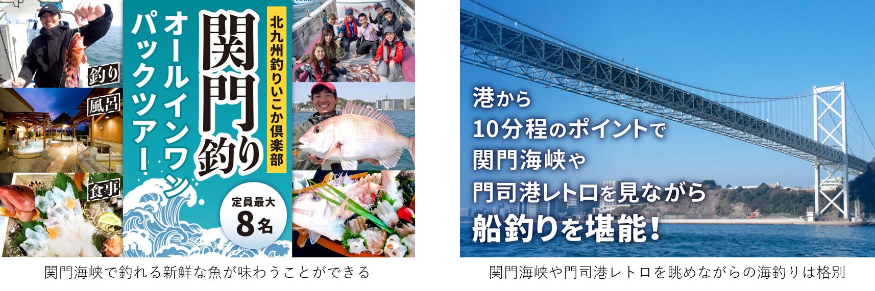 遊漁船の手配、道具(タックル・仕掛け)のレンタル、フィッシングガイドサポート、提携飲食店にて釣った魚でのお食事、照葉スパリゾート門司店にてお風呂