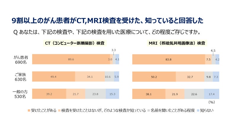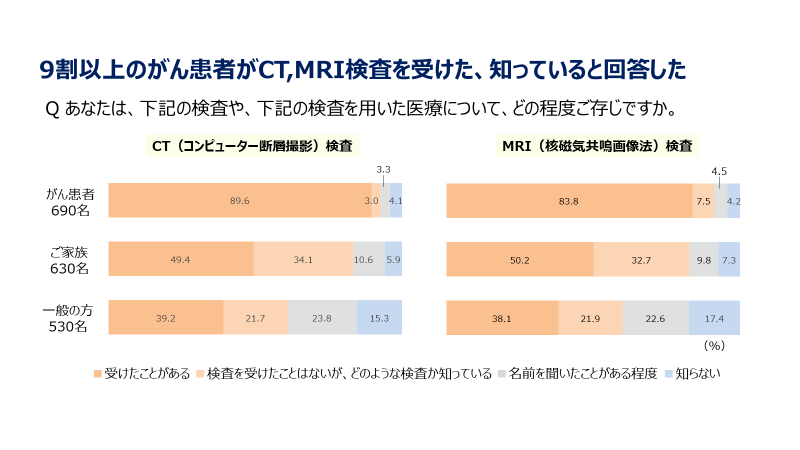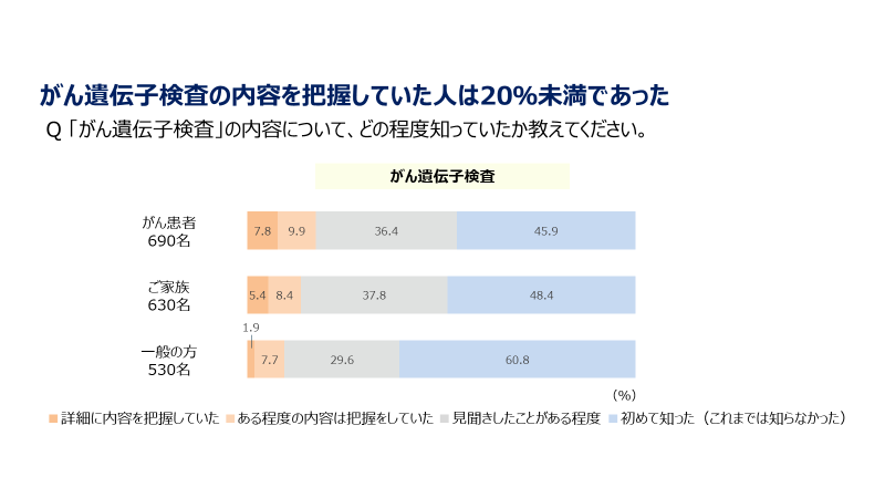 本セミナーは、がん患者さんのCTやMRIの検査の認知率が9割以上※であるのに対して、がん遺伝子検査の内容を把握している人が2割未満※にとどまっていることから、がんの個別化治療についてより多くの人に知っていただくことを目的に企画いたしました。調査の詳細は、別添資料をご参照ください。