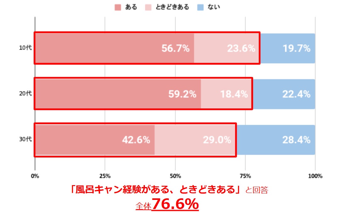 どの世代も7割以上が風呂キャンセルの経験があると回答し、特に10代は8割を超える高い数値となりました。SNSを中心に「風呂キャンセル界隈」ということばが流行ったのも、それだけ皆さんが共感するポイントが多かったということではないでしょうか。実は風呂キャン界隈という方、意外と周りに多いのかもしれませんね!
