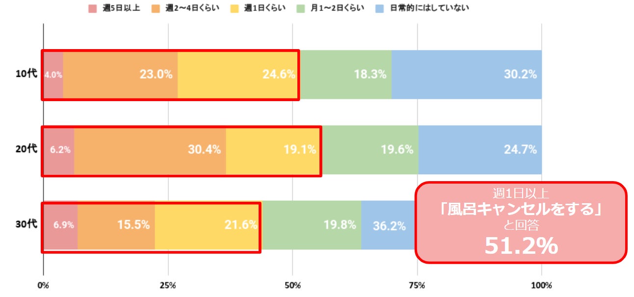 本当に疲れているときだけ!など、不定期で風呂キャンセルをする方が多いのかと思いきや、「週1日以上風呂キャンセルをする」と習慣化している方が全体の半数以上いることが判明しました。