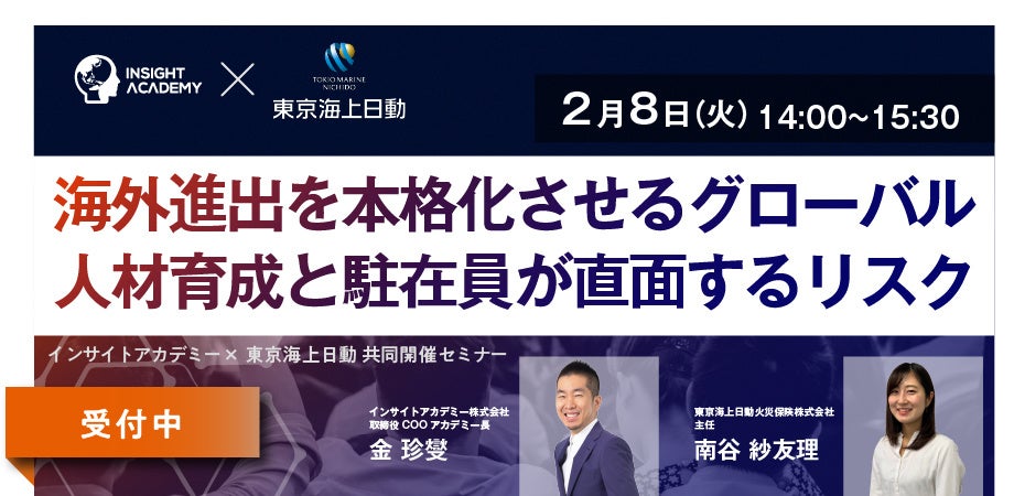 グローバル⼈材育成・研修業を⼿掛けるインサイトアカデミー株式会社と、海外進出企業へのリスクマネジメント支援を手掛ける東京海上日動火災保険株式会社は、「海外進出を本格化させるグローバル人材と駐在員が直面するリスク」無料zoomセミナーを、2022年2⽉8⽇(火)14時より開催致します。