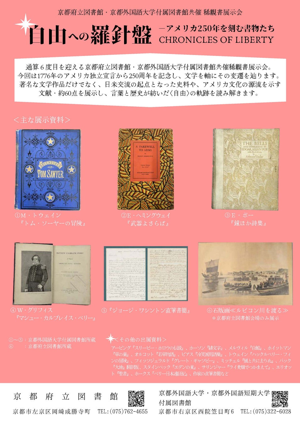 【京都外国語大学×京都府立図書館】アメリカ独立250周年記念 稀覯書展示会『自由への羅針盤 ―アメリカ250年を刻む書物たち』を共同開催