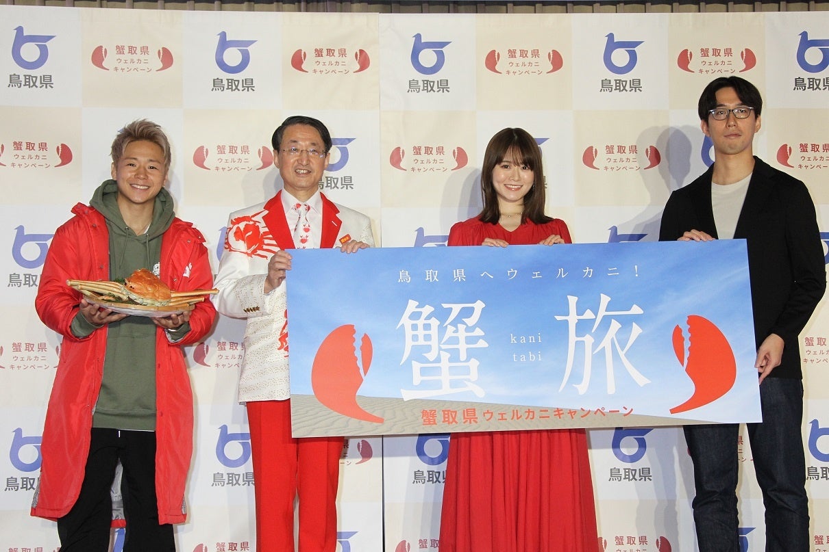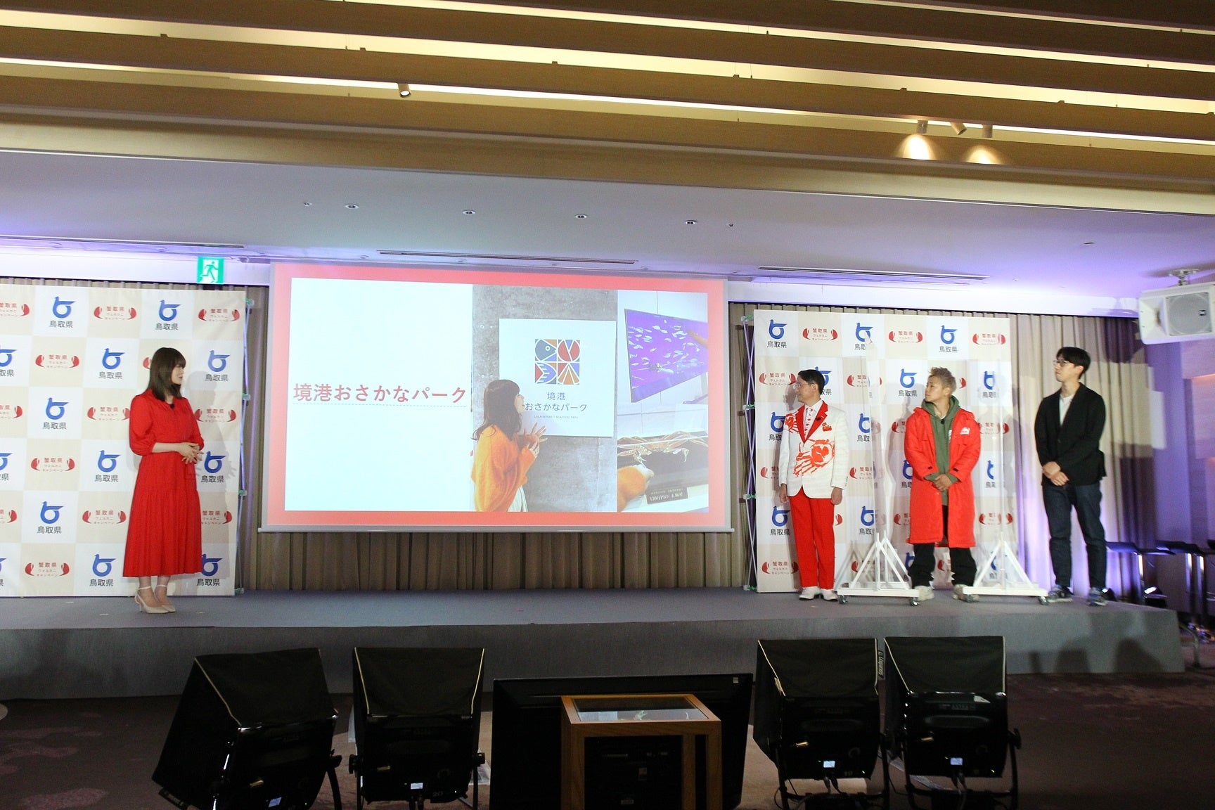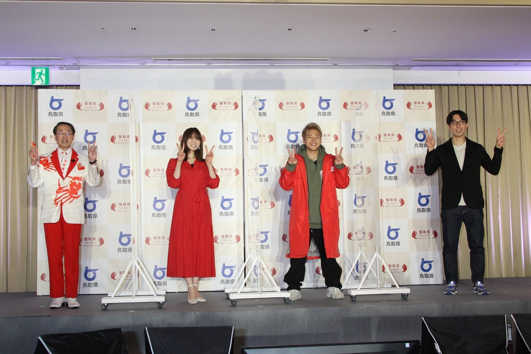 発表会では、平井伸治鳥取県知事が登壇、ゲストに株式会社ソウゾウの代表取締役CEO・石川佑樹さん、今年度の蟹取県アンバサダーの山崎怜奈さん、また立会人として格闘家の武尊さんをお招きして、株式会社ソウゾウの運営する「メルカリShops」とタッグを組み、手軽に鳥取県の特産品が購入出来ると大人気な「メルカニShops」の割引キャンペーンの紹介の他、武尊さん立会いのもと、山崎怜奈さんの蟹取県アンバサダー委嘱式や、今年度のテーマでもある「蟹×旅」の山崎さんおすすめコースの紹介を行い、最後は登壇者全員Vサインのカニポーズで「蟹取県へウェルカニー!」の掛け声で発表会を締めくくりました。