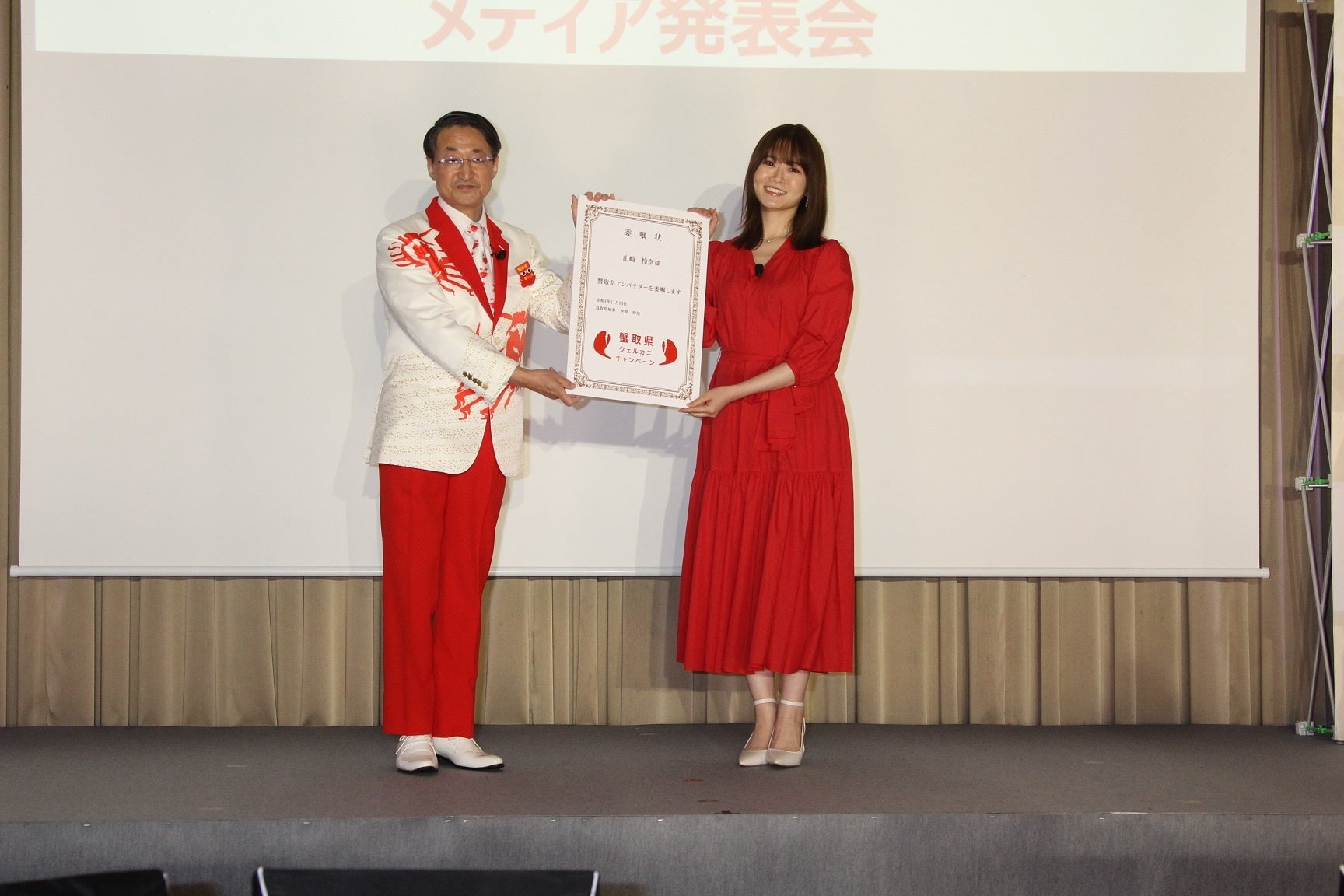 その後、平井知事より委嘱状を山崎さんに授与、さらに、「今回『蟹取県アンバサダー』の山崎さんと『とっとりふるさと大使』の武尊さんへの記念品として鳥取県の松葉ガニのトップブランド『五輝星(いつきぼし)』と梨の『王秋(おうしゅう)』をご用意させていただきました!」とサプライズ発表!