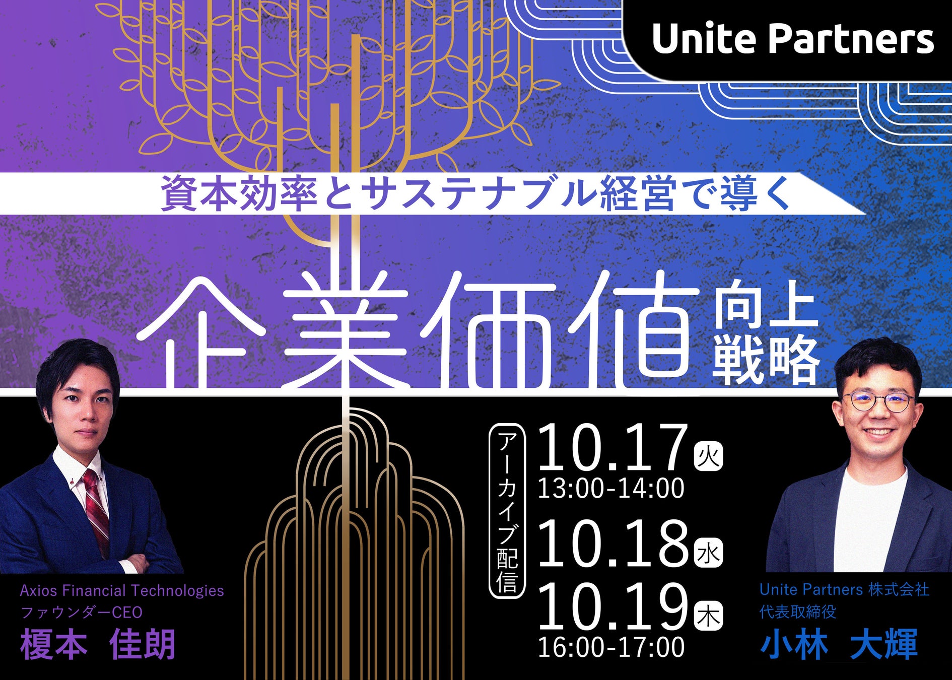 企業の変革パートナーを目指すブティック型コンサルティングファームのUnite Partners株式会社(本社:東京都、代表取締役:小林大輝)は、2023年10/17~19 に、「企業価値向上戦略 〜資本効率とサステナブル経営で導く〜 」と題して大企業の経営幹部の方向けのセミナーを開催します。