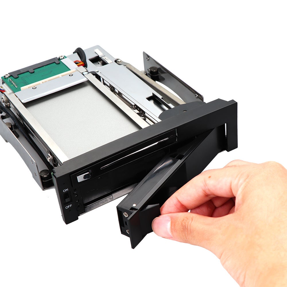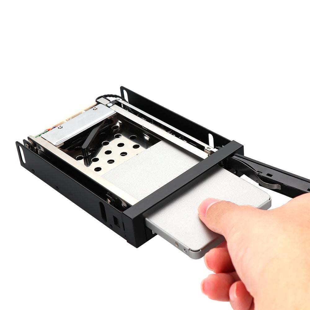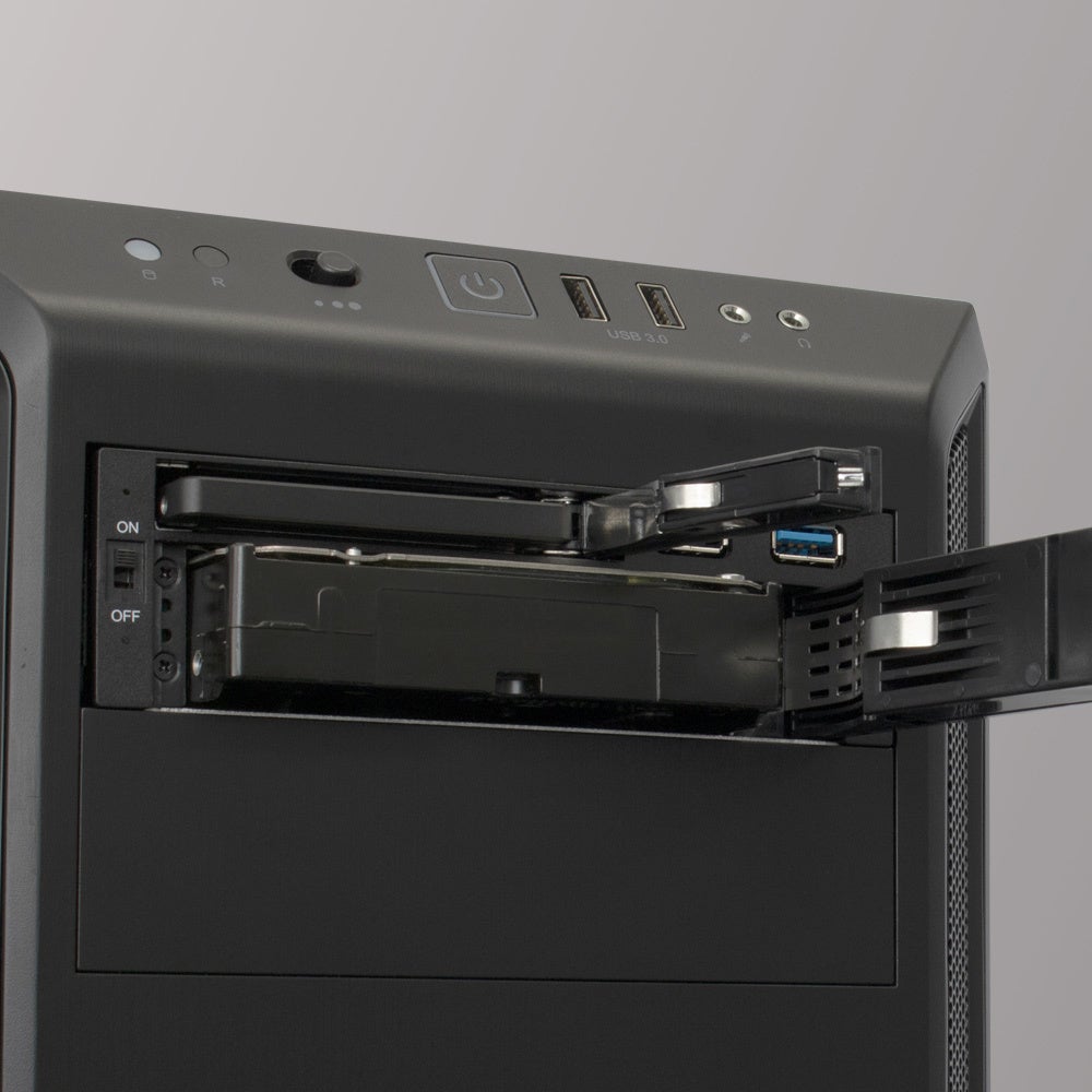 本商品は、SATA仕様対応で動画配信の録画や映像編集時に肥大化するデータを効率よく運用したい方に、必要に応じて脱着交換できる利便性を追求したリムーバブルケースです。簡単にハードディスクやSSDを脱着できるよう、ネジや専用のカートリッジを必要としないので、ガチャ!ポン!パッ!の3ステップで簡単に増設ができます。