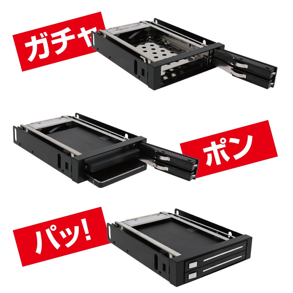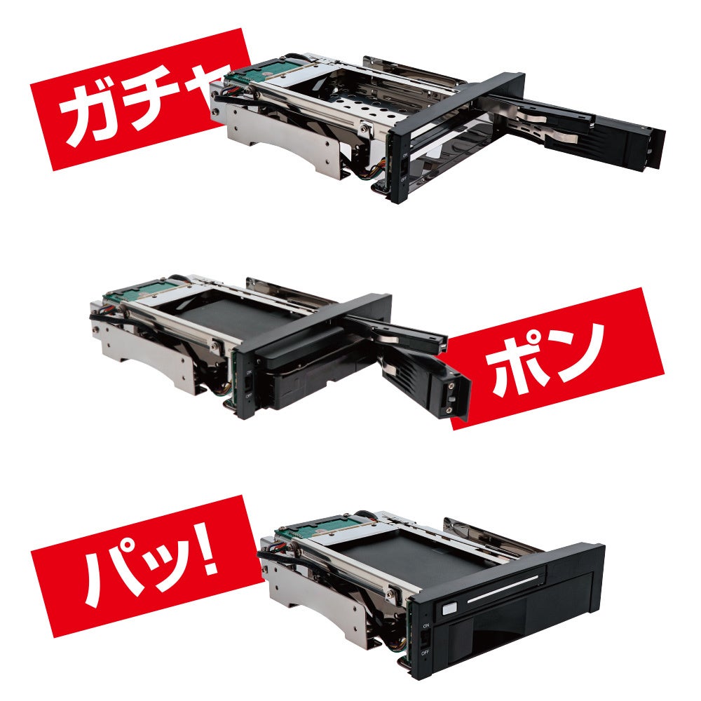 SSDやHDDをインナートレイに入れる必要がなく、SSD/HDDへのネジ留めも不要のため、ドライブをポンと入れてすぐにお使いいただけます。ガチャ!ポン!パッ!の3ステップで簡単に増設ができます。