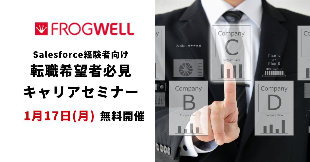 データ・プロセスのコンサルティング及びアウトソーシングサービスを提供しているフロッグウェル株式会社(所在地 : 東京都港区、 代表 : 大田宏之、以下「フロッグウェル」)は、『Salesforce経験を生かした転職する前に、絶対に知っておきたい10個のキャリアプラン』をテーマとしたオンラインセミナーを、転職を希望するSalesforce経験者に向けて1⽉17⽇(月)に無料で開催いたします。
