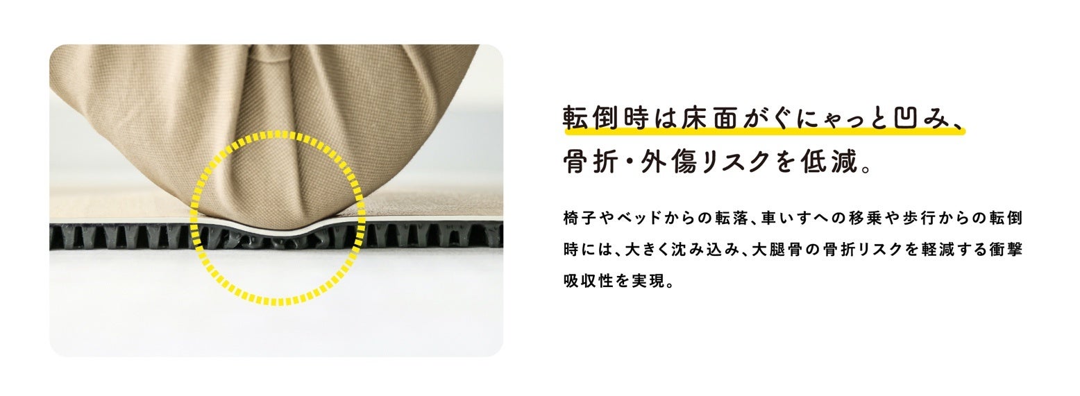 「ころやわ」は、これまで両立が困難とされていた「歩行快適性」と「衝撃吸収性」という2つの性質を合わせ持つ、今までにない構造を採用した、転んだ時には凹んで衝撃を低減しつつ普段は快適に歩ける新しい床材です。歩行困難に陥りやすい大腿骨の骨折は、高齢者の場合、221kgf以上の荷重がかかると発生するといわれています。「ころやわ」を敷くだけで150kgf程の荷重に低減でき、大腿骨の骨折リスクは大幅に低減します。