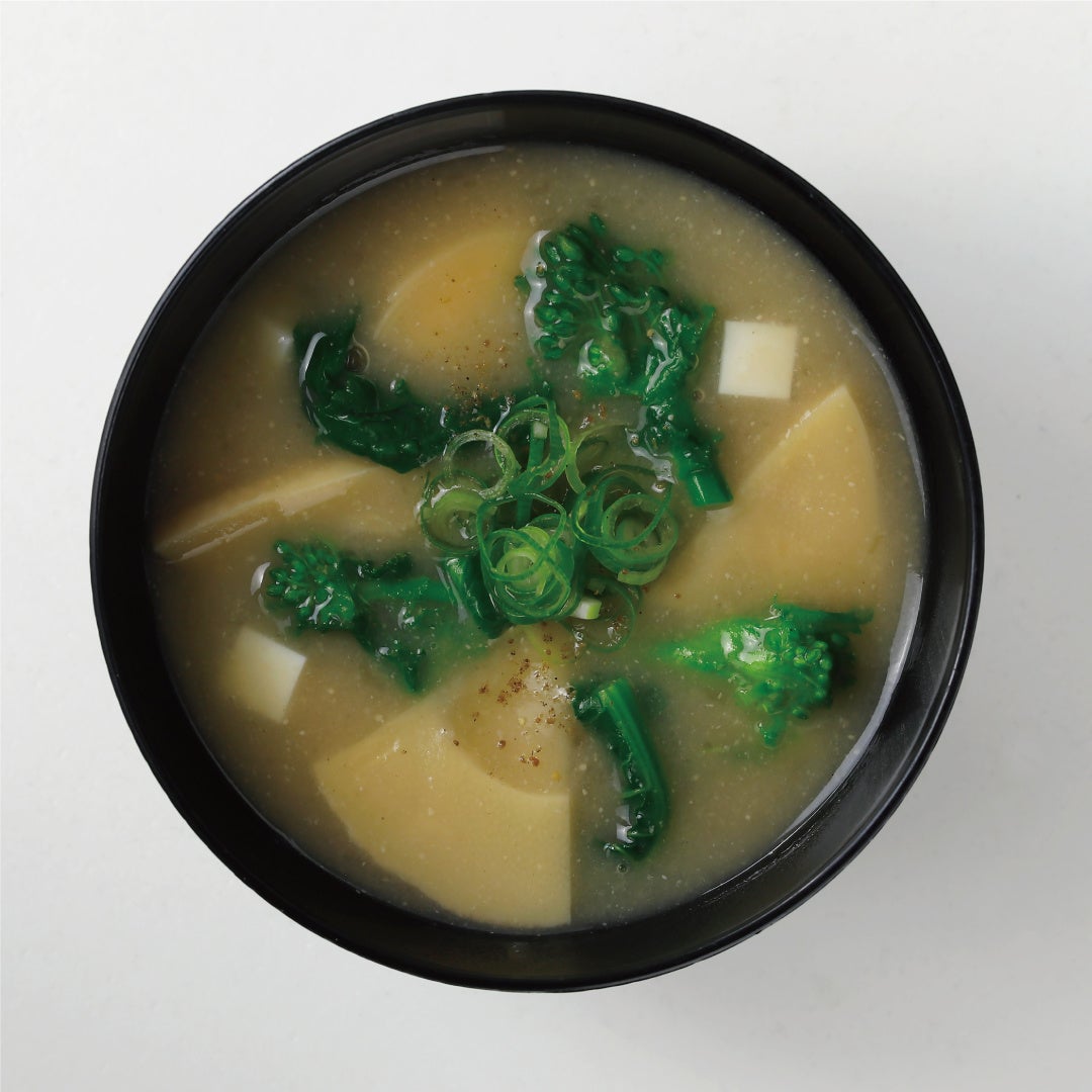 旬を迎えた歯応えの良い筍と、ほろ苦い菜の花。田舎味噌と白味噌を合わせた、春の訪れを満喫する一杯です。