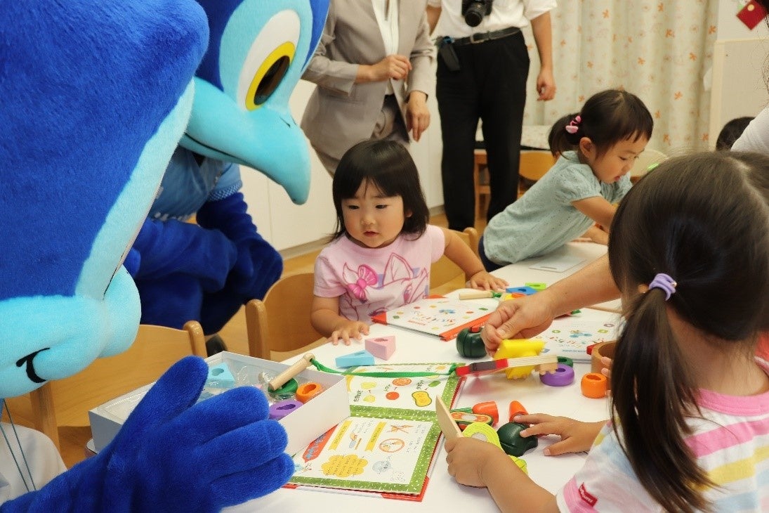 贈呈後、ことり園の皆さんとおもちゃで一緒に遊ぶ時間が設けられました。初めて見るおもちゃにみんな興味津々。ジュビロくん、ジュビィちゃんと一緒に楽しく遊びました。