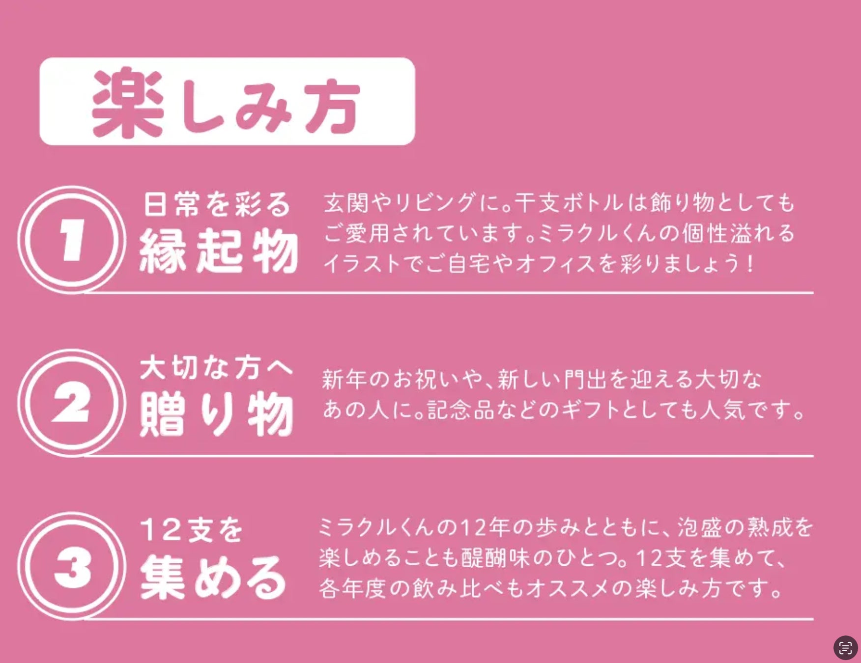 「飲んで美味しい」「見て楽しい」「集めて嬉しい」ミラクルくんの干支ボトル。