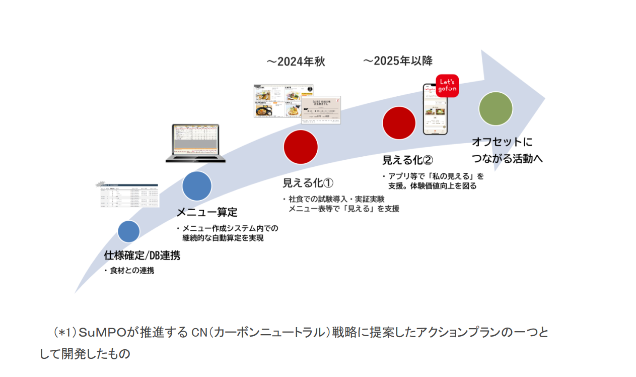 本プロジェクトでは、グループ合計全国約3,900カ所で1日約130万食の食を支えるエームサービスのシステムなどと、SuMPOが構築した「レシピdeカーボンフットプリント(炭素版カロリー)」(*1)を連携し、食事メニューへの継続的なGHG排出量表示のためのインフラ開発を推進。2024年秋ごろより三井物産株式会社の社員食堂において実証実験を予定しています。これにより、食事や栄養摂取を管理するための指標となるカロリー表示と同様、消費者が地球の健康バロメーターとして日常生活の中で「カーボン(CO₂)」に触れ、実感し、意識できる社会を目指します。