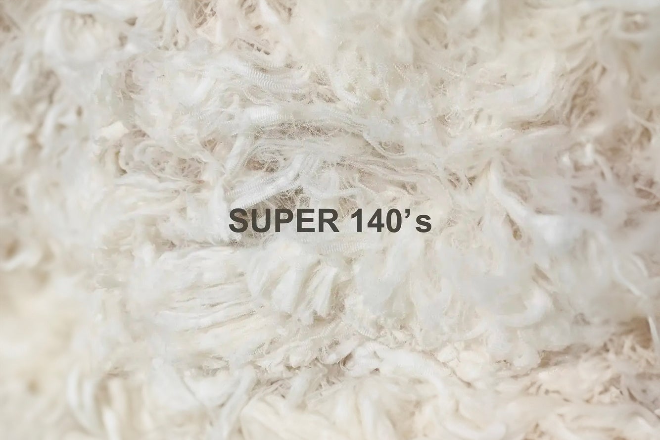 SUPER 140'sとは、「原毛1kgで140kmの長さの糸を作ることができる」ことを意味します。SUPER表記が高くなればなるほど、繊維が繊細で細くなり、生地にした際の風合いが滑らかになります。