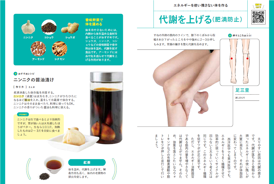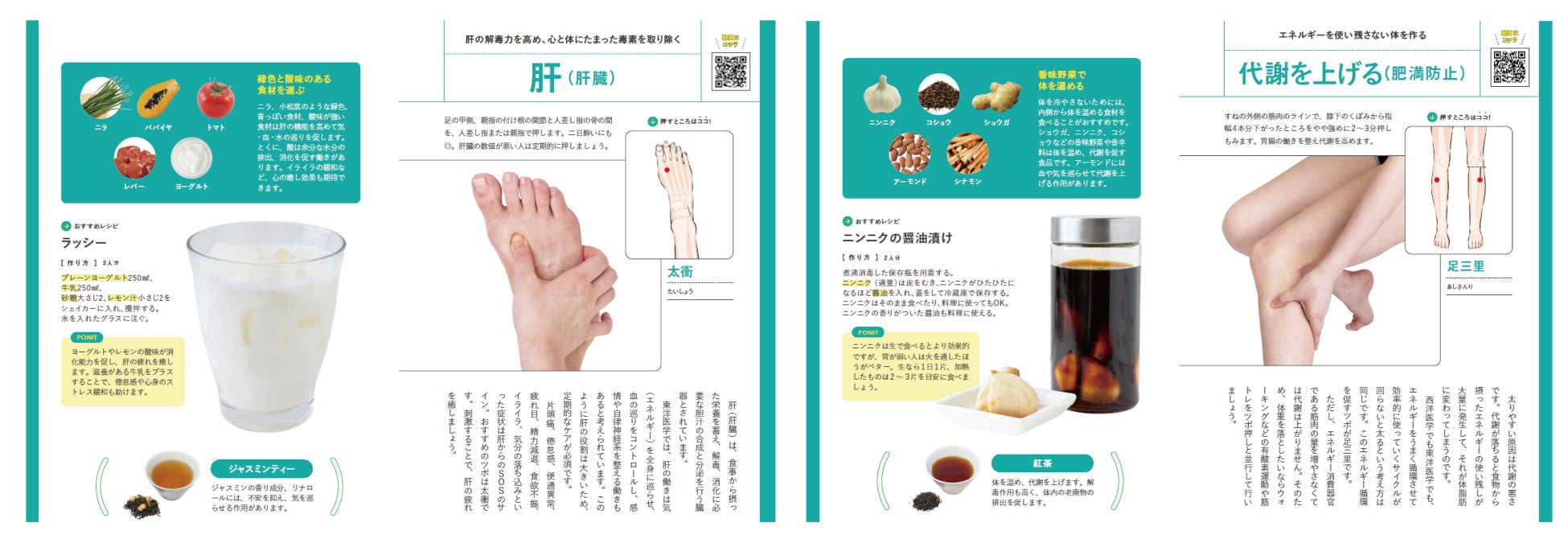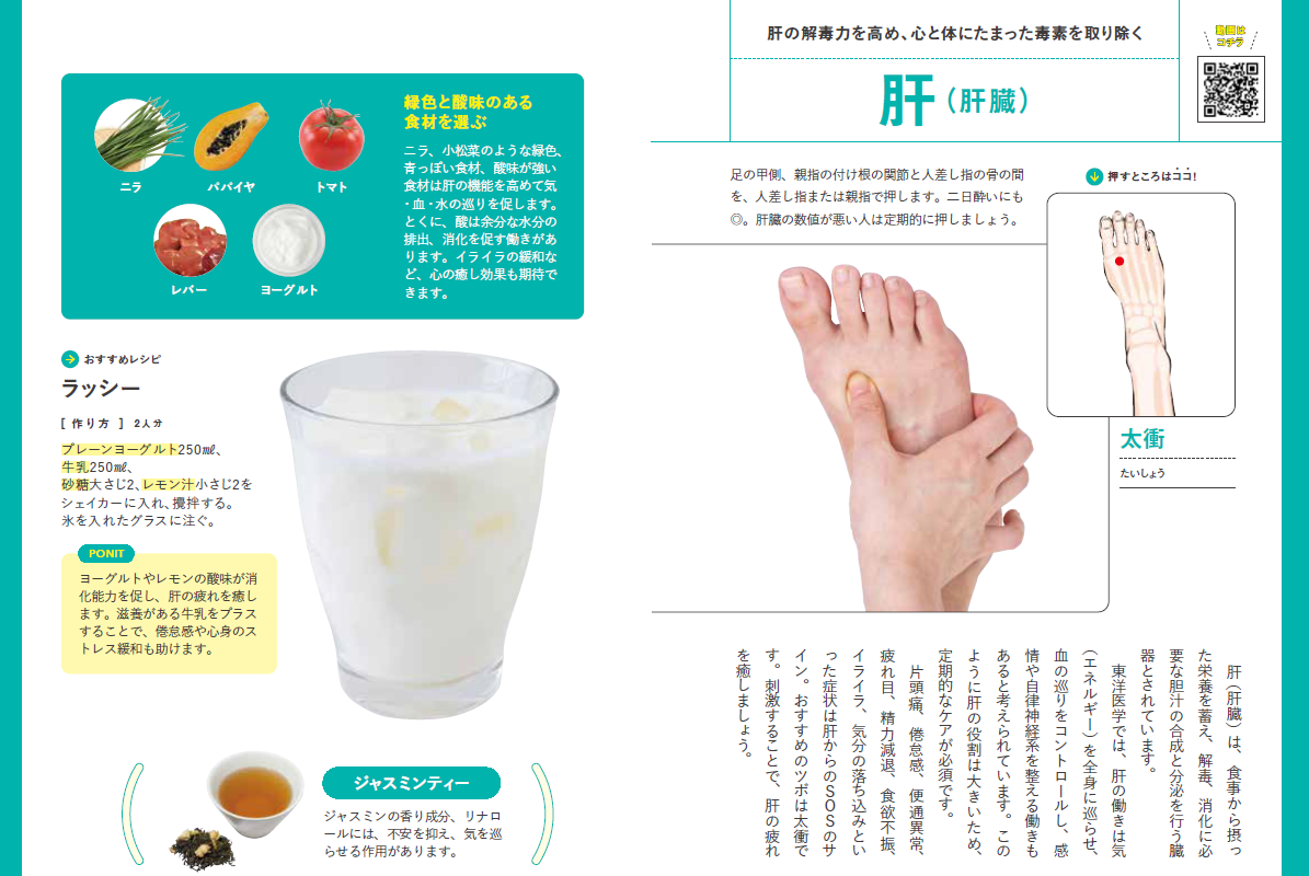 体質別ケア図鑑のパートでは、チェックテストで体質を知り、陥りやすい痛みや不調を遠ざけるために毎日押したいおすすめのツボや生薬、お茶を紹介するなど、長期的な健康維持にも活用できる2段構えの1冊となっています。
