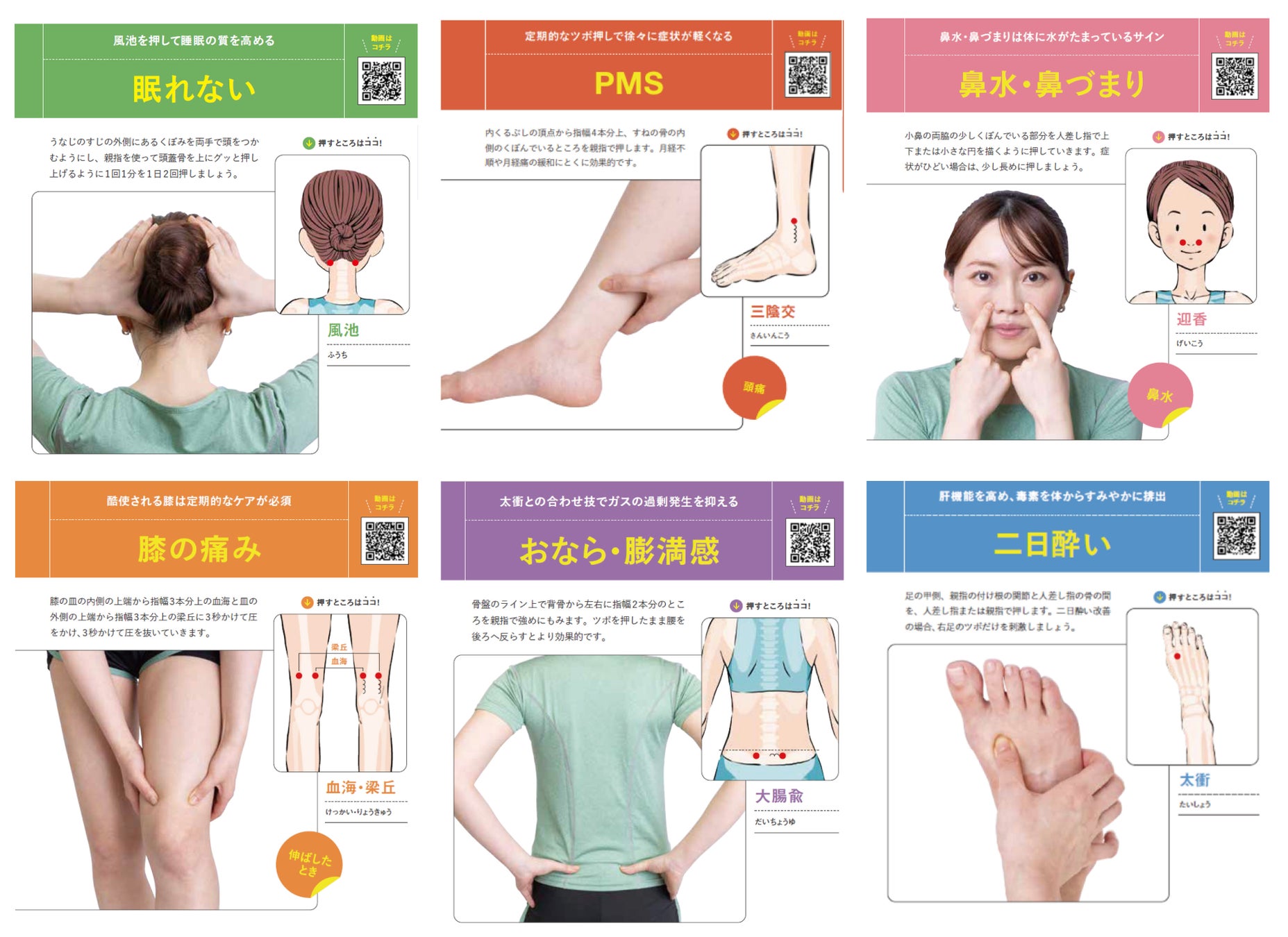 誌面では、写真とイラストに加え、QRコードからアクセスすることで動画でもツボの位置がわかる構成に。また、慢性化を防ぐツボや、ツボ以外の手軽に症状を緩和する方法も紹介し、全力であなたの痛みや不快に応えます。