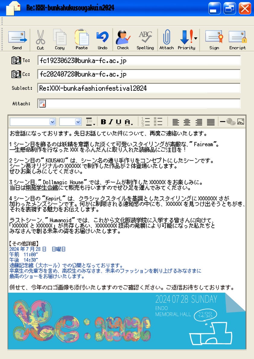 今回、ショーを企画した学生が掲げたファッションショーのテーマは、“Re:xxx”。「電子メールの返信を意味する『Re:』。