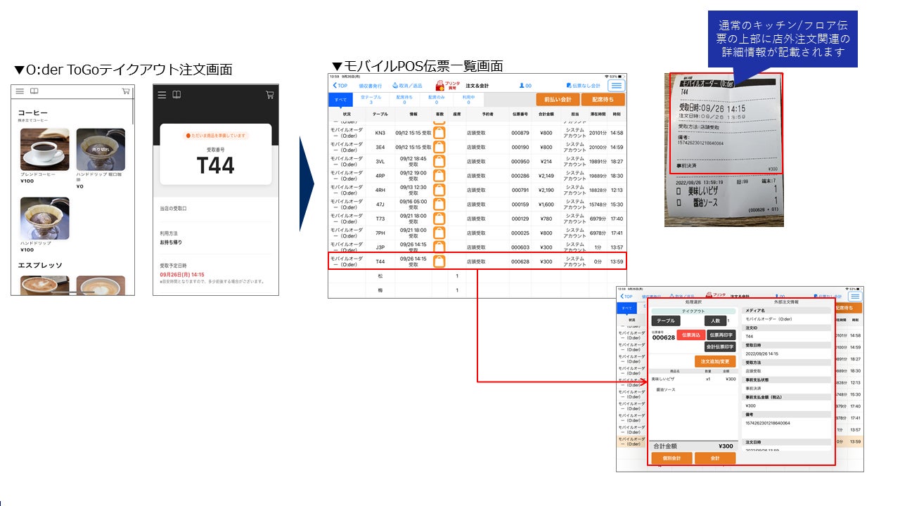 3:モバイルPOSの伝票一覧画面にてテイクアウト注文として自動登録され、キッチン伝票が印字