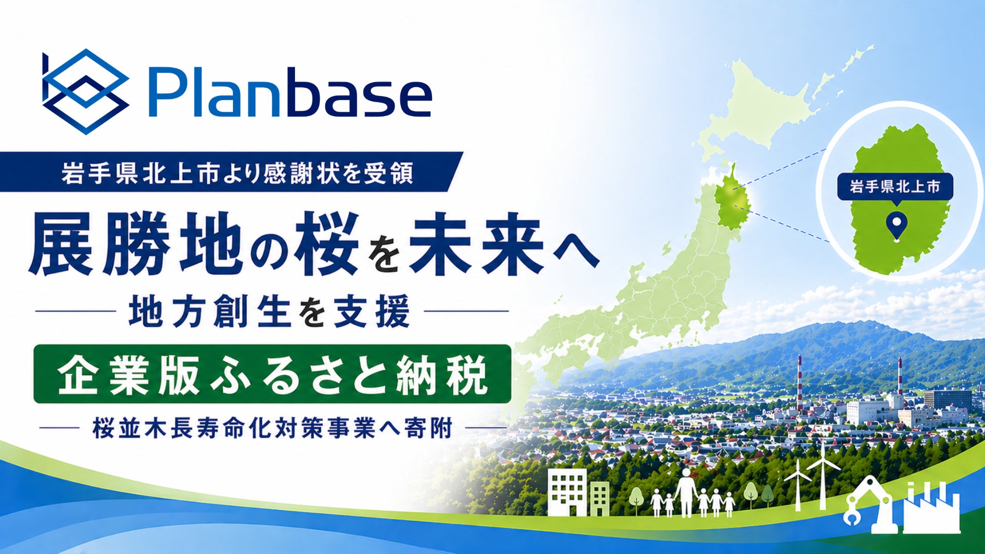 中小企業向け経営・補助金コンサルティングを手がける株式会社プランベース(本社:東京都千代田区、代表取締役:武衣 貴志)は、岩手県北上市に対し、「企業版ふるさと納税(地方創生応援税制)」に基づく寄附を行いました。本寄附は、同市の「展勝地桜並木長寿命化対策事業」を支援するものであり、2026年4月23日に北上市役所本庁舎にて開催された贈呈式において、北上市長より感謝状を受領いたしましたので、お知らせいたします。