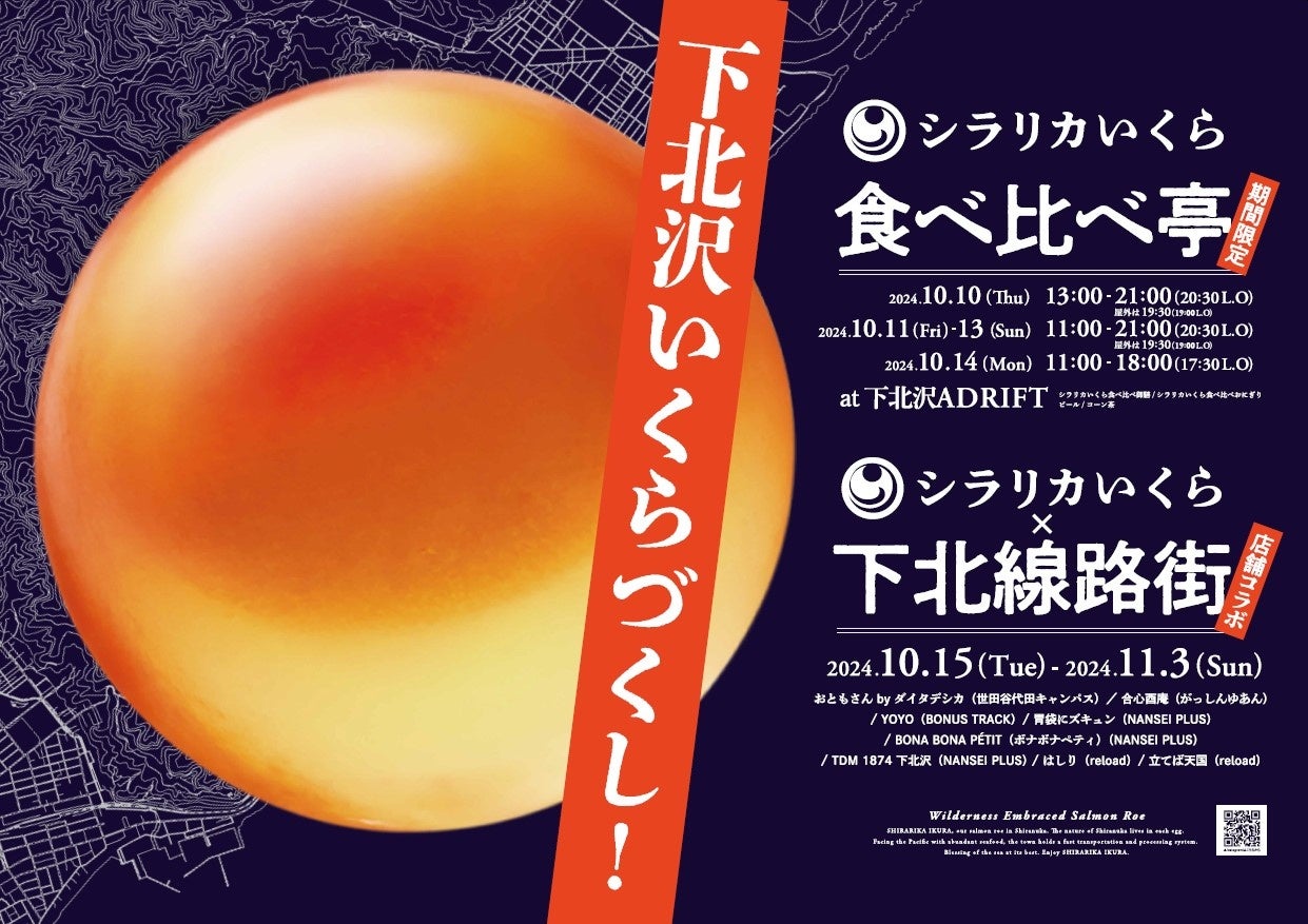 株式会社イミュー(代表取締役:黒田 康平)、株式会社playknot(代表取締役:本屋敷匠真・山口恭兵)、株式会社Right Design(代表取締役:小川 貴之)及び北海道・白糠町(しらぬかちょう)が運営する「シラリカブランドプロジェクト実行委員会」は、希少な生いくら「シラリカいくら」を使用したコラボメニューを、2024年10月15日(火)から11月3日(日)まで、東京・下北線路街の飲食店8店舗にて提供します。本イベントは、10月10日(木)から14日(月)に開催されるポップアップレストラン「シラリカいくら食べ比べ亭」に続く、第二弾の飲食店コラボレーション企画です。
