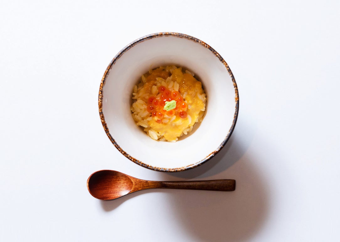 根室産の雲丹を混ぜた寿司ライスに「シラリカいくら」をトッピングした逸品です。