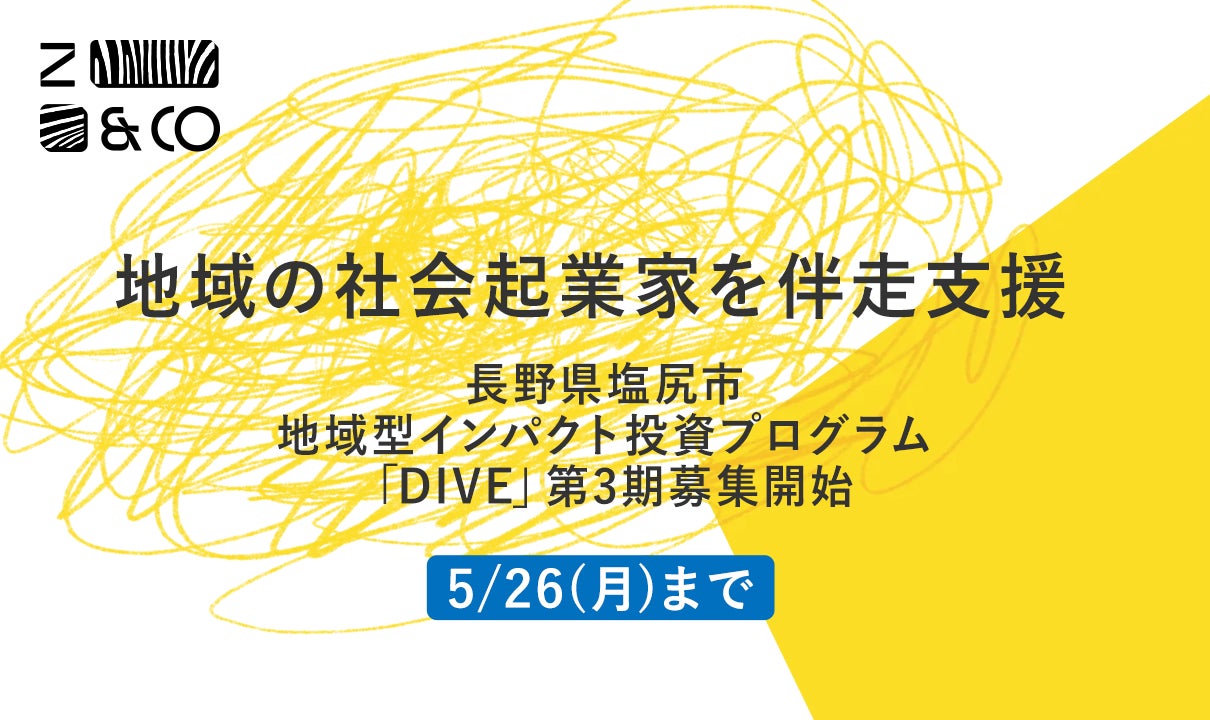 株式会社Zebras and Company(ヨミ:ゼブラ アンド カンパニー、本社:東京都港区麻布十番、代表取締役:阿座上陽平、田淵良敬、以下Z&C)は、長野県塩尻市の支援を受け運営する一般財団法人塩尻市振興公社(本社:長野県塩尻市大門八番町1−2、代表理事:塩川昌明)、ソーシャルM&A®️ファームGOZEN(ヨミ:ゴゼン、運営:株式会社drapology / CEO:布田尚大、以下GOZEN)と共に、社会的インパクト投資の地域実装を目的とした『地域型インパクト投資実証プログラム「DIVE」』第3期の募集を5月2日より開始します。