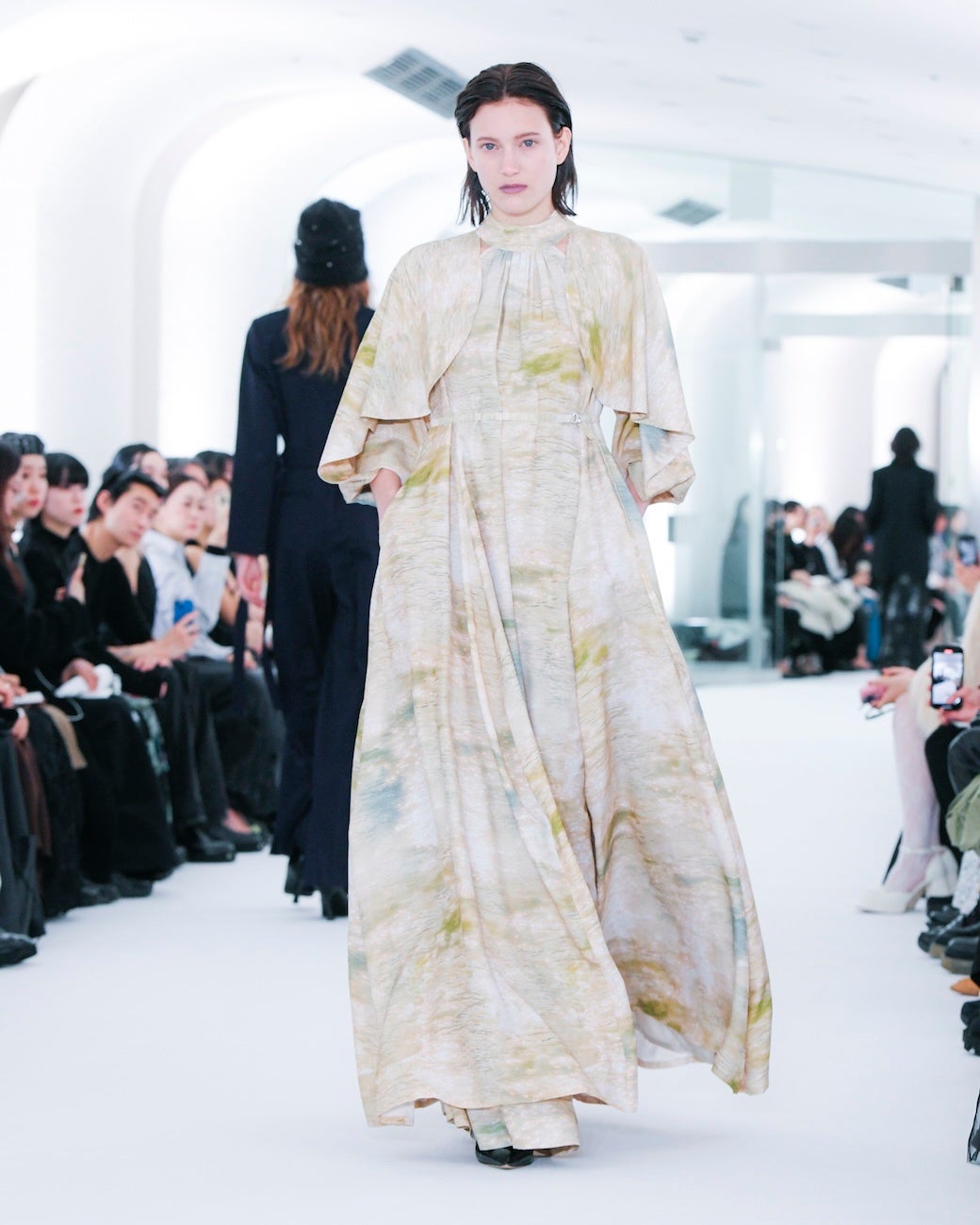 素材にはトリアセテート混のバックサテンジョーゼットを使用。裏目のサテン組織を表にし、適度なハリとコシを持ちながらも滑らかなドレープ感を生み出しています。「夜明けの純粋さ」を纏い、新たな自分との出会いを感じられる一着です。