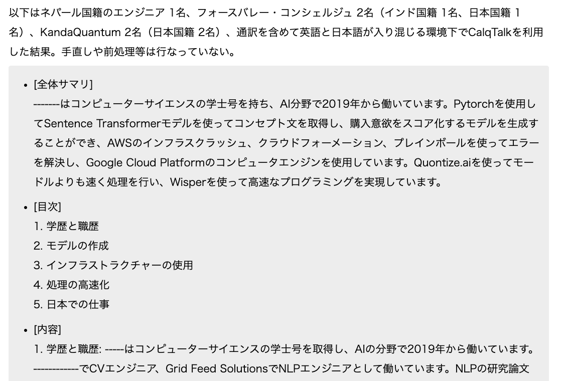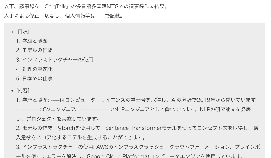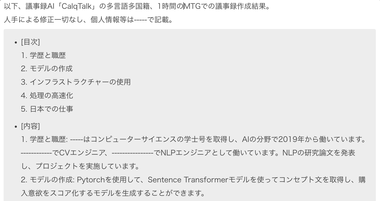 以下、通訳を含めて英語と日本語が入り混じる環境下の1時間のミーティングを「CalqTalk」により全自動で出力した結果となります。