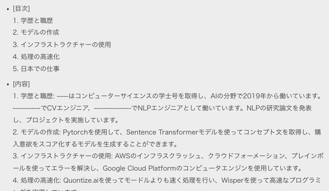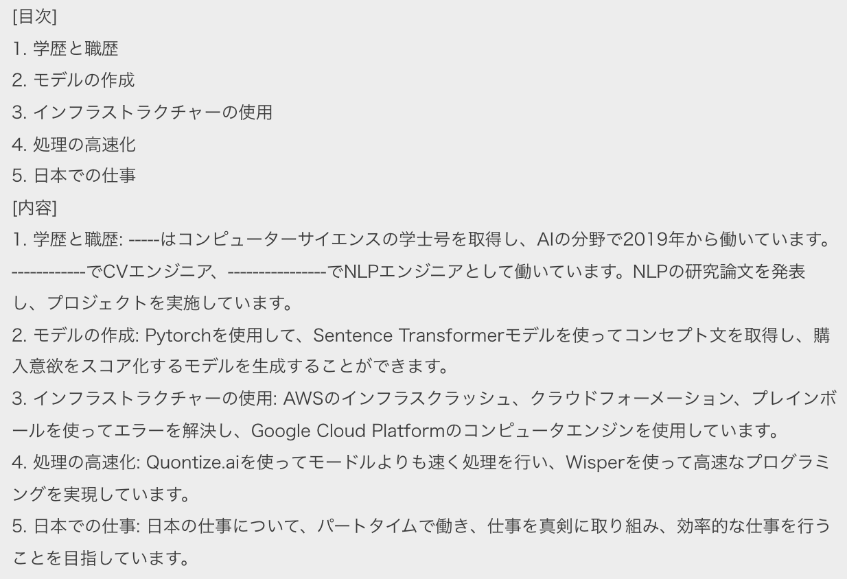 -------はコンピューターサイエンスの学士号を持ち、AI分野で2019年から働いています。Pytorchを使用してSentence Transformerモデルを使ってコンセプト文を取得し、購入意欲をスコア化するモデルを生成することができ、AWSのインフラスクラッシュ、クラウドフォーメーション、プレインボールを使ってエラーを解決し、Google Cloud Platformのコンピュータエンジンを使用しています。Quontize.aiを使ってモードルよりも速く処理を行い、Wisperを使って高速なプログラミングを実現しています。 -