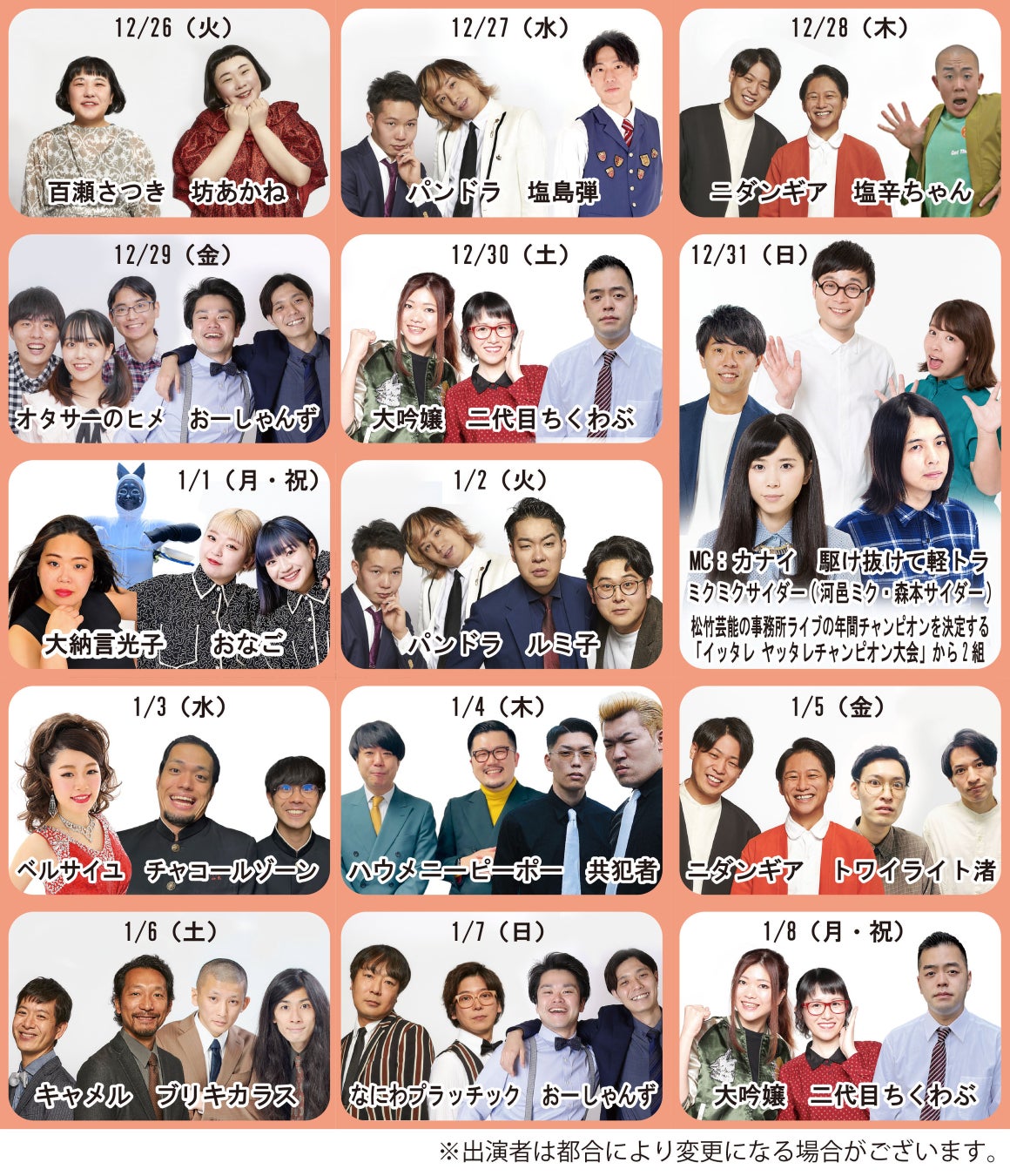 2023年12月26日(火)~2024年1月8日(月・祝)の冬休み期間、松竹芸能のお笑い芸人による日替わりステージを毎日行います。