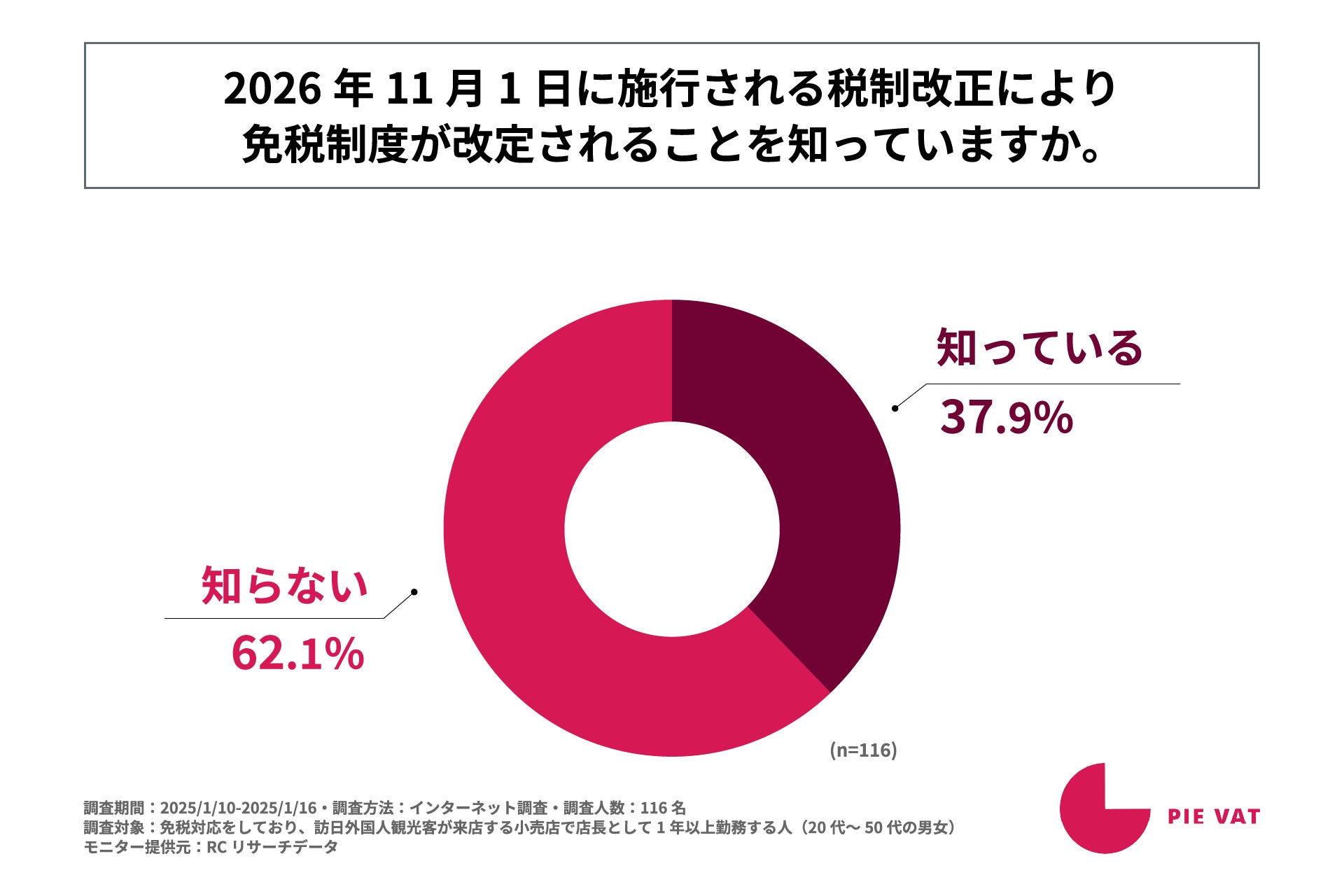 次に、「2026年11月1日に施行される税制改正により免税制度が改定されることを知っているか」を問う設問への回答では、「知らない」が62.1%、「知っている」が37.9%という結果となり、大半の店長が2026年11月1日に施行される税制改正により免税制度が改定されることを知らないことが判明しました。