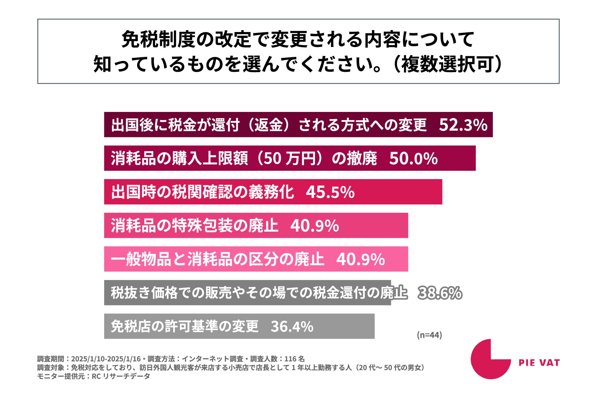 調査の最後、2026年11月1日に施行される税制改正により免税制度が改定されることを知っていると回答された方に「免税制度の改定で変更される内容について知っているもの」を尋ねる設問への回答では、1位が「出国後に税金が還付(返金)される方式への変更」で52.3%、2位が「消耗品の購入上限額(50万円)」で50.0%、3位が「出国時の税関確認の義務化」で45.5%という結果になりました。この結果から「出国後に税金が還付(返金)される方式への変更」に関して認知している人が多いことがわかりました。