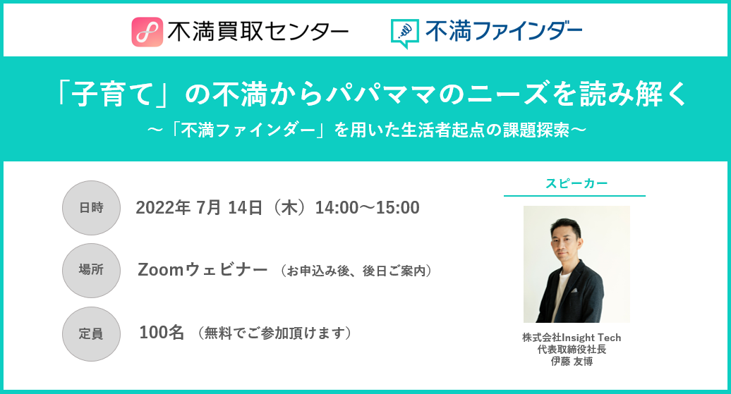 株式会社 Insight Tech(東京都新宿区、代表:伊藤友博、以下 Insight Tech)は、同社が運営する『不満買取センター』に寄せられた子育てにまつわる不満を対象に、『不満ファインダー』で解析した結果を考察したWebセミナーを開催致します。