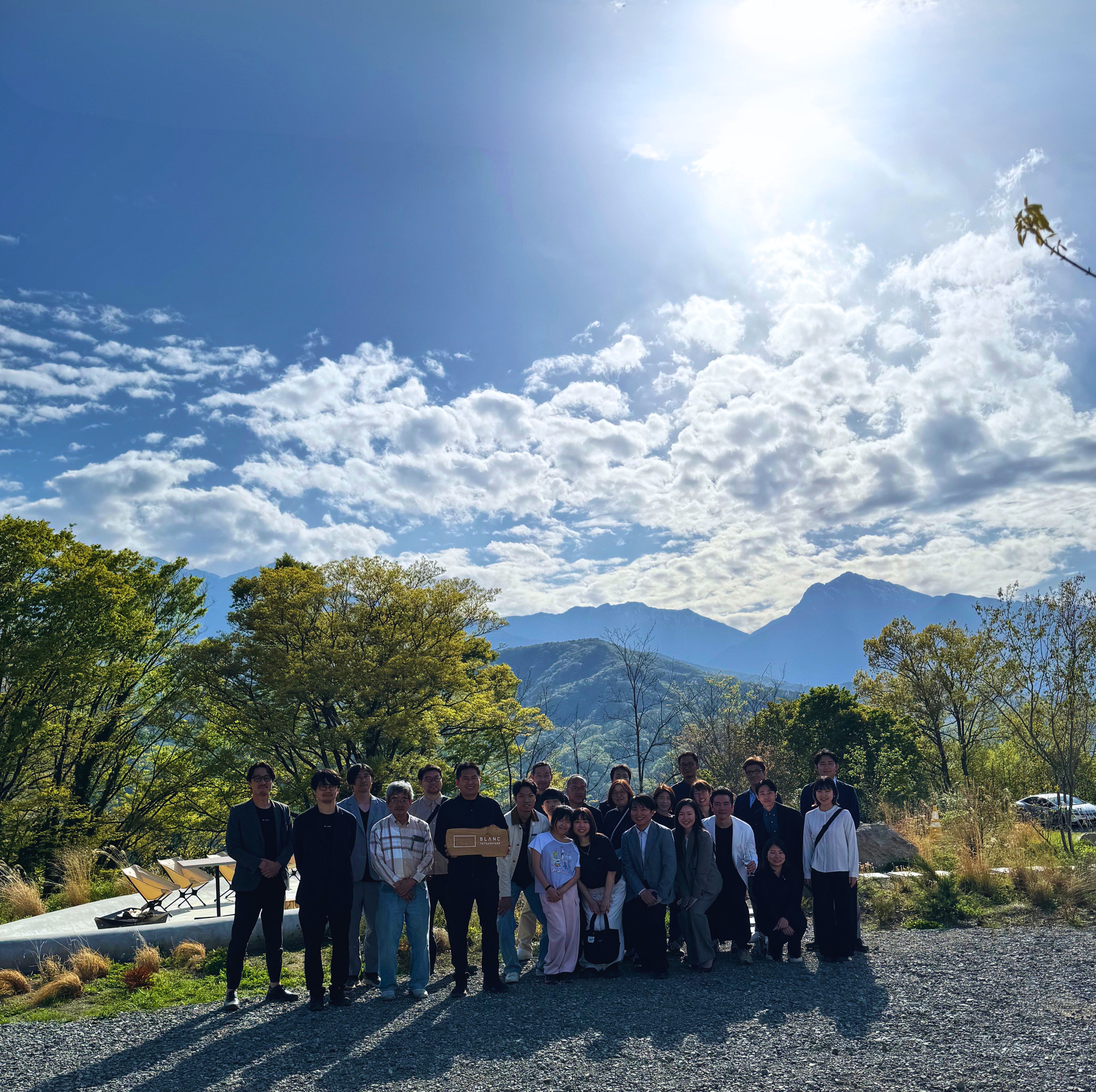 最後は八ヶ岳の山脈をバックに参加者全員で記念撮影。
