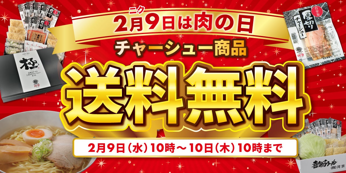 株式会社河京(本社:福島県喜多方市、代表取締役:佐藤富次郎)は、2022年2月9日(水)に『肉の日』としまして、自家製厚切りチャーシューや、チャーシュー付商品の送料無料キャンペーンを実施します。