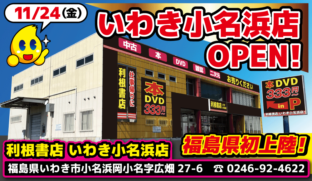 潜在的な社会問題「男の終活」解決のため年間160万本のDVDを買取!地方の娯楽インフラ!群馬発バラエティ系リユース店が福島県に初出店!「利根書店いわき小名浜店」11月24日(金)オープン!