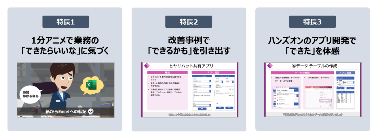 「はじめてのPowerApps講座」は、PowerAppsの使い方の解説にとどまらず、自身の業務でどう役立つかをイメージしながら、実際にアプリとして形にするまでを一連で体験できる講座です。1分アニメ・業務事例・ハンズオンを通じて、受講者は「できたらいいな」「できるかも」「できた」という3つの手応えを得ることで、業務改善の第一歩を踏み出すことができます。
