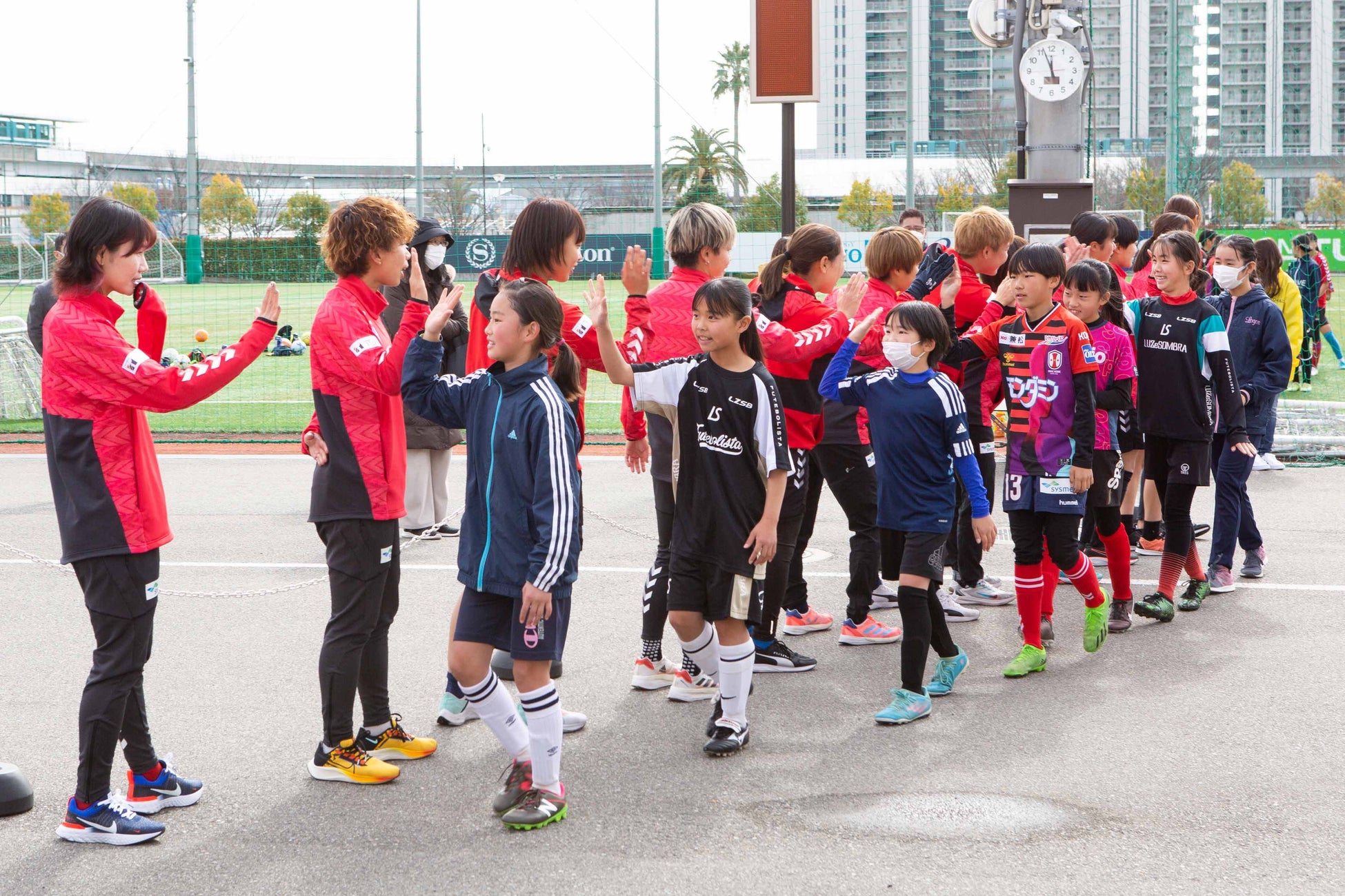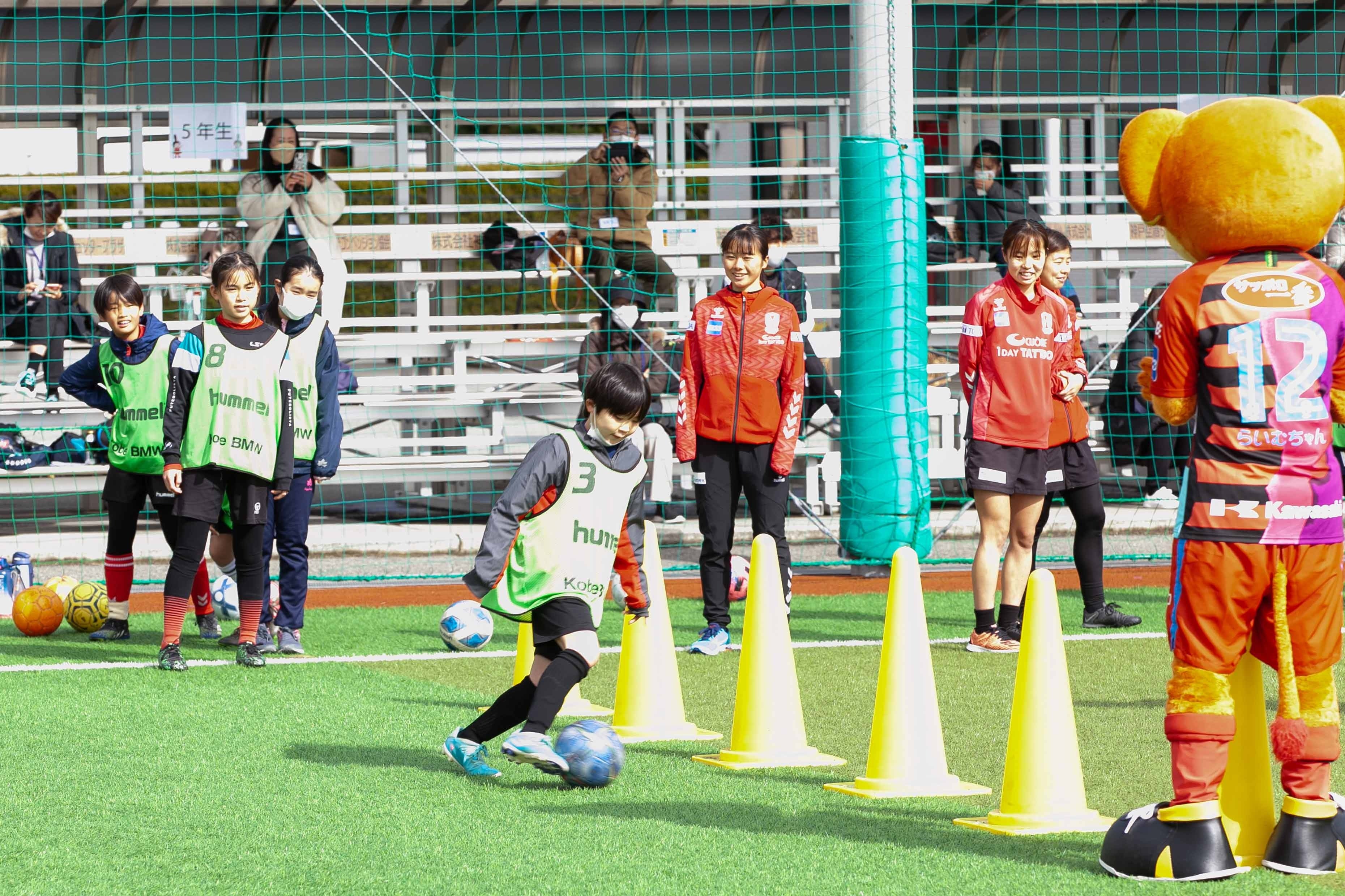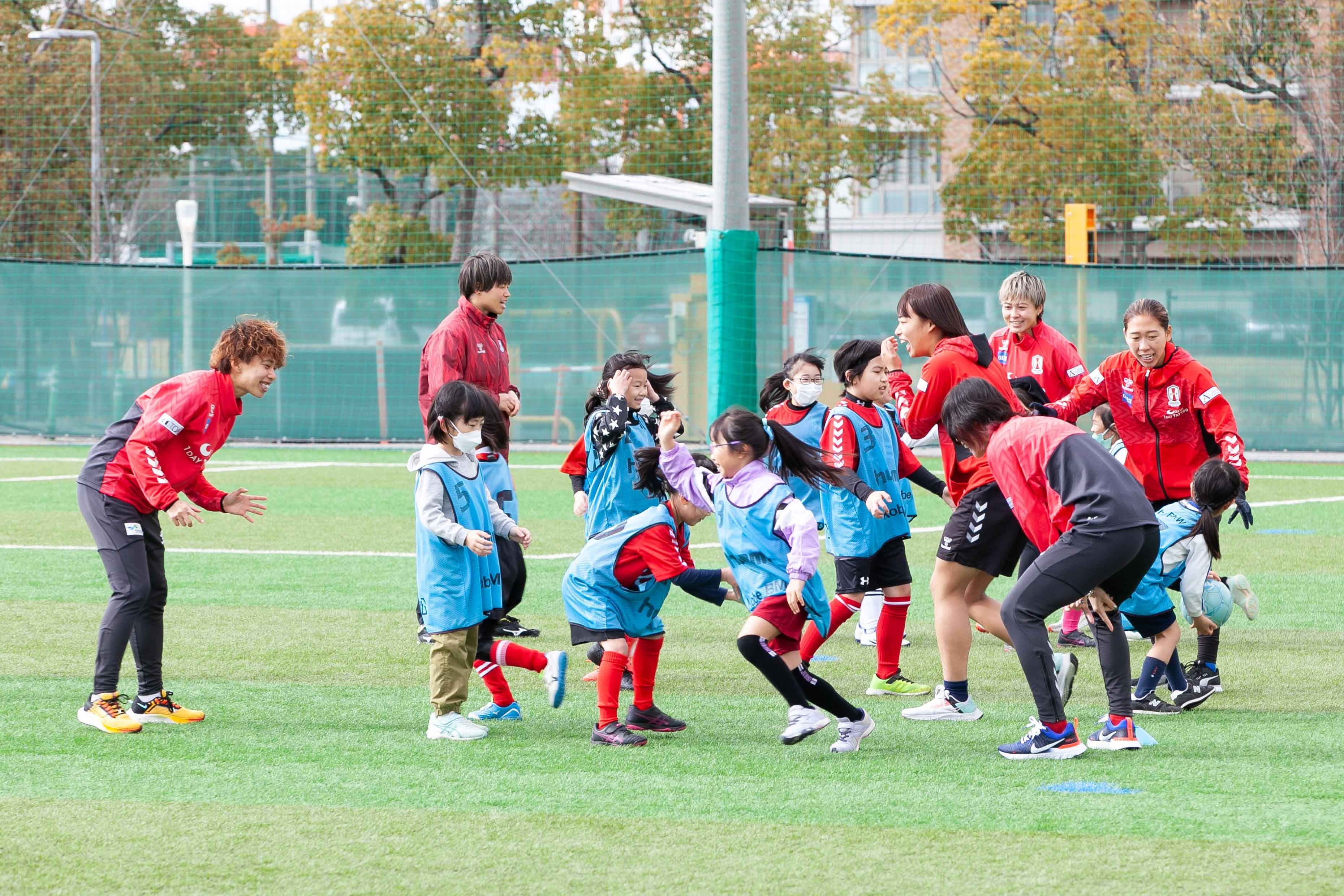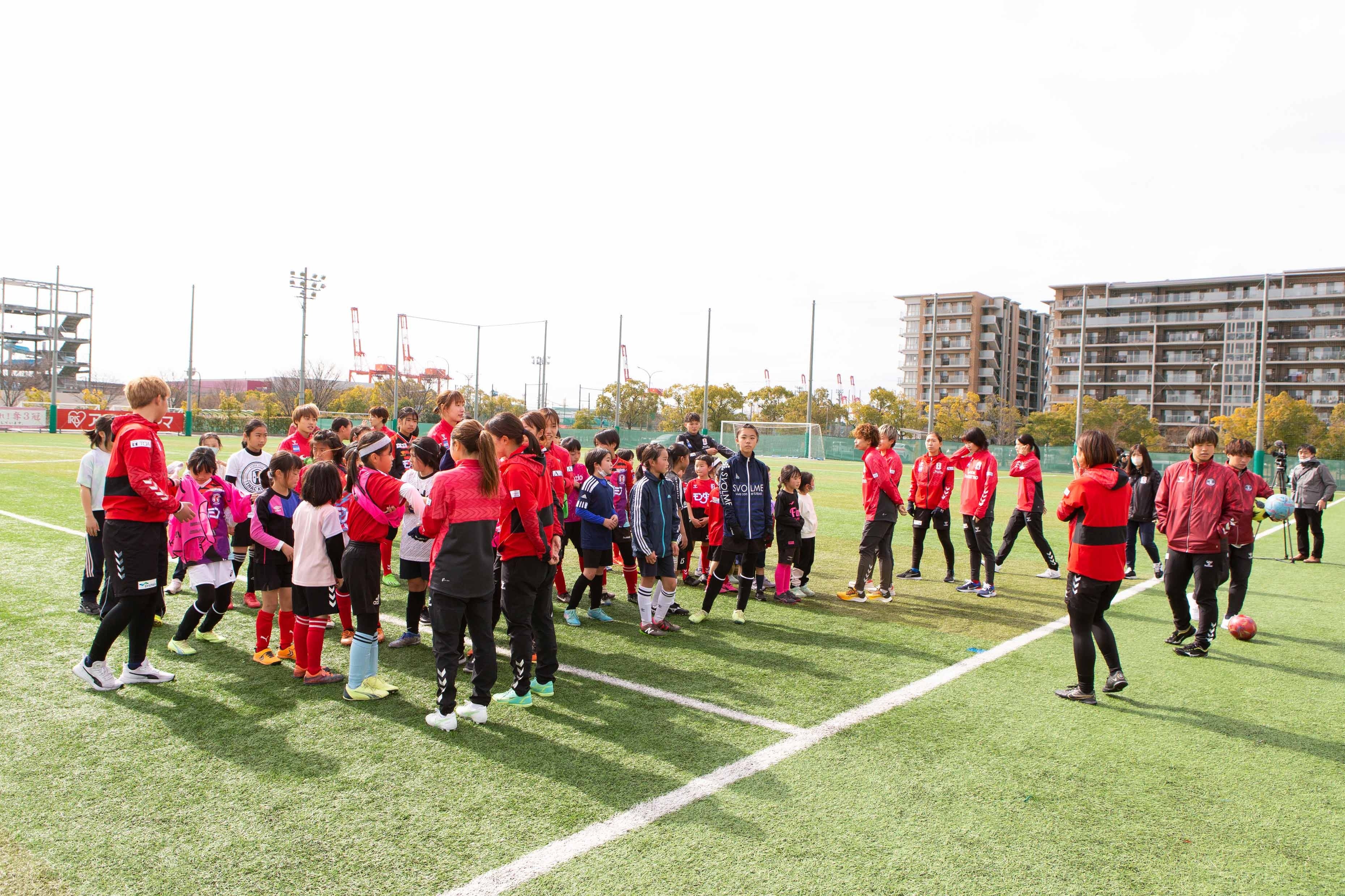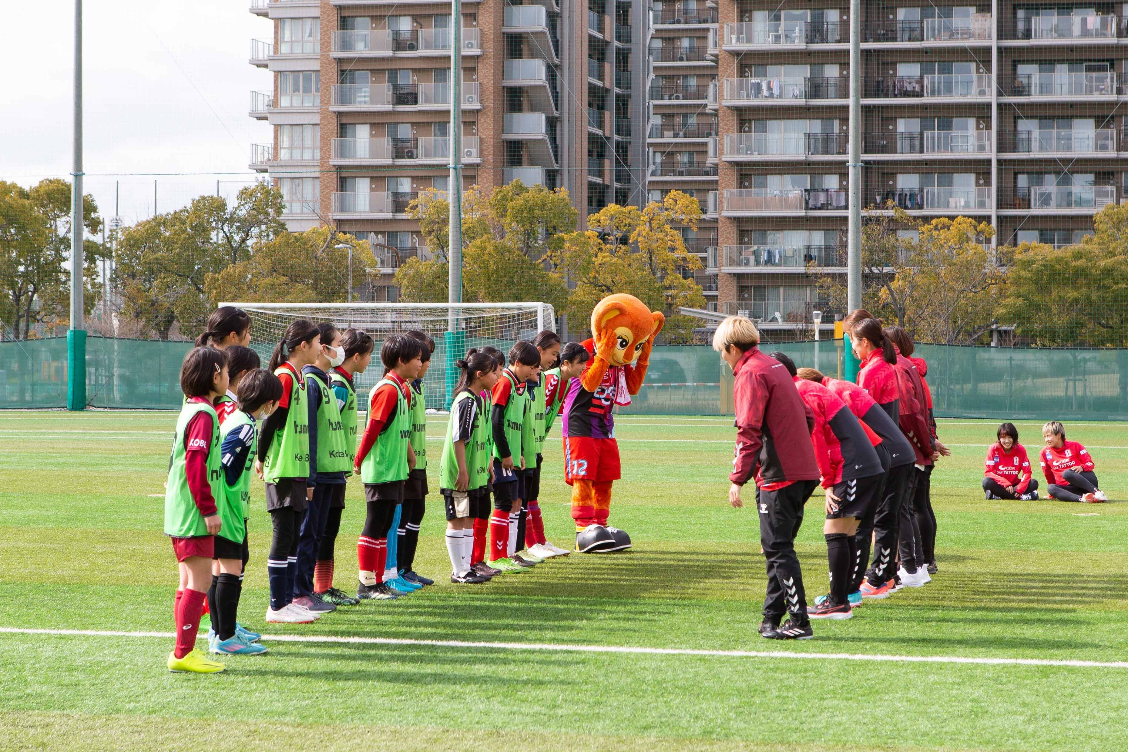 冠婚葬祭を主として事業を行う「株式会社ベルコ」がINAC神戸レオネッサと協力し、2月11日に神戸市東灘区の神戸レディースフットボールセンターでサッカー教室を開催致しました。小学1年生から6年生までの女子児童を対象に、INAC神戸の現役選手25名が指導にあたり、学年ごとの数グループに分かれて基礎的な練習から参加者のレベルに応じた練習を行いました。