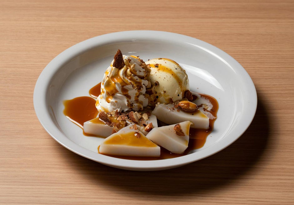 住吉の久寿餅とバニラアイス、生クリームを黒蜜ではなくキャラメルソースで愉しめるスイーツです。久寿餅は人肌程度にほんのり温めることで甘みを引き出し、アイスや生クリームとの相性よく仕上げています。香ばしいナッツが食感のアクセントになっています。