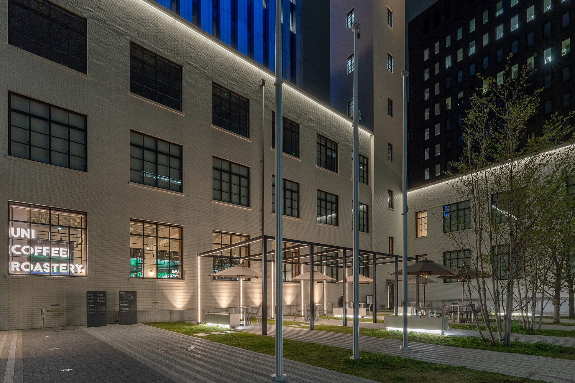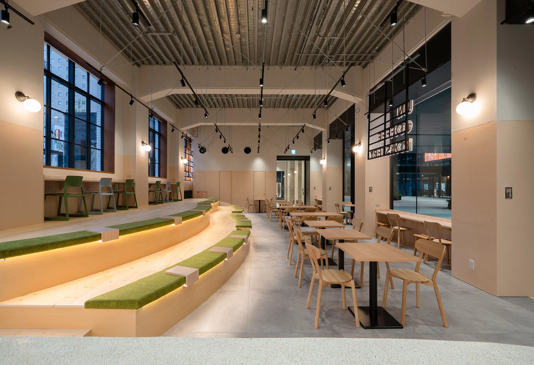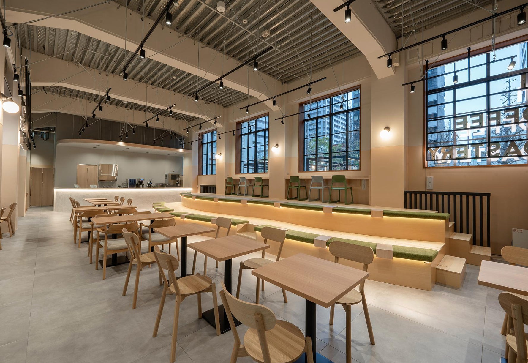 川崎市初出店となるUNI COFFEE ROASTERY 川崎市役所は市役所本庁舎の復元棟内にあります。復元棟は戦時中の空襲も耐え抜いて市民に親しまれてきた時計塔など、昭和13年に建築された旧本庁舎の一部を復元した建物です。当店はこの復元棟の高い天井高や大きな窓など、オリジナルの魅力を活かした内装とし、階段状のベンチが外との繋がりを演出する開放感あふれる設計となっております。