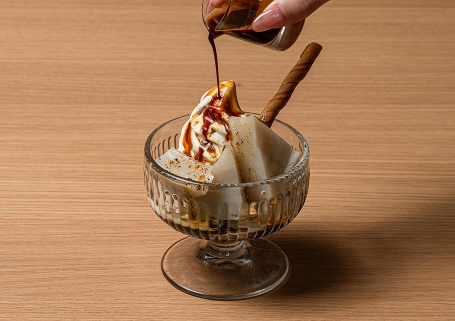 住吉の久寿餅とチョコクランチにソフトクリームを乗せて、エスプレッソをかけたアフォガートです。エスプレッソの濃厚な味わいにソフトクリームの甘みを加えた濃厚な味わいと、久寿餅の弾力ある食感をお楽しみください。